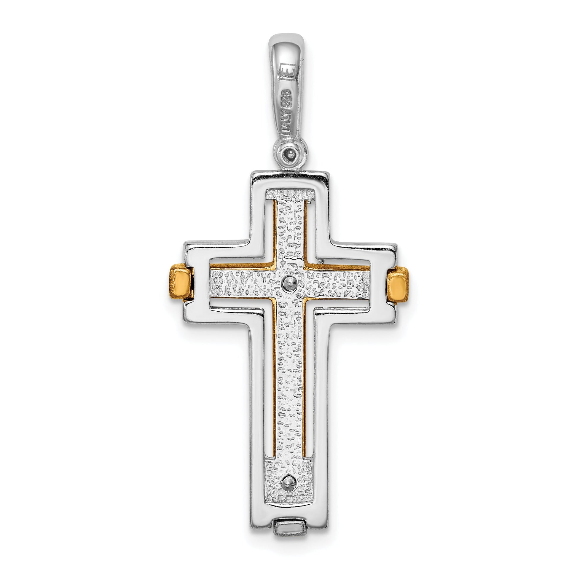 The Sterling Silver Rhodium-Plated & Gold-Tone Brushed/Polished Cross Pendant is a stunning piece of jewelry. With its 925 purity sterling silver as its primary material, this pendant brims with elegance. The rhodium plating enhances its luster while ensuring durability. Accented with gold tones, it offers a captivating blend of colors. Measuring 29.2 mm in length and 18.8 mm in width, this solid pendant features a concave profile, adding depth and dimension to its design. Carefully crafted through a casting process, it combines brushed and polished finishes for a timeless look. Elevate your jewelry collection with this unique pendant.