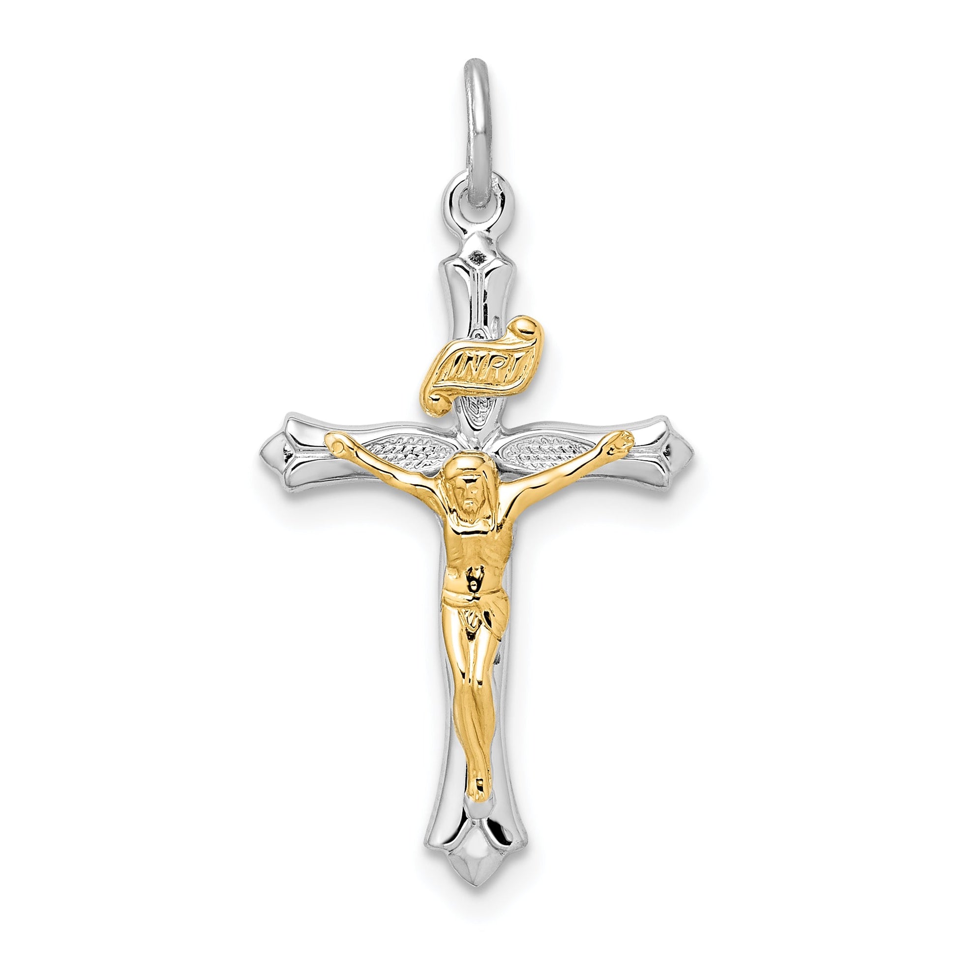 The Sterling Silver Rhodium-Plated & Gold Tone Crucifix Pendant is a stunning piece that blends elegance with faith. Crafted from 925 sterling silver, this pendant boasts a polished finish that adds shine. The rhodium plating provides a sleek, white backdrop, while the gold-tone accent adds a touch of warmth. Measuring 25.5 mm in length, 15.45 mm in width, and 2.8 mm in thickness, its flat-back design lies comfortably on the skin. Showcasing classic style, the Sterling Silver Rhodium-Plated & Gold Tone Crucifix Pendant makes a meaningful addition to any jewelry collection.