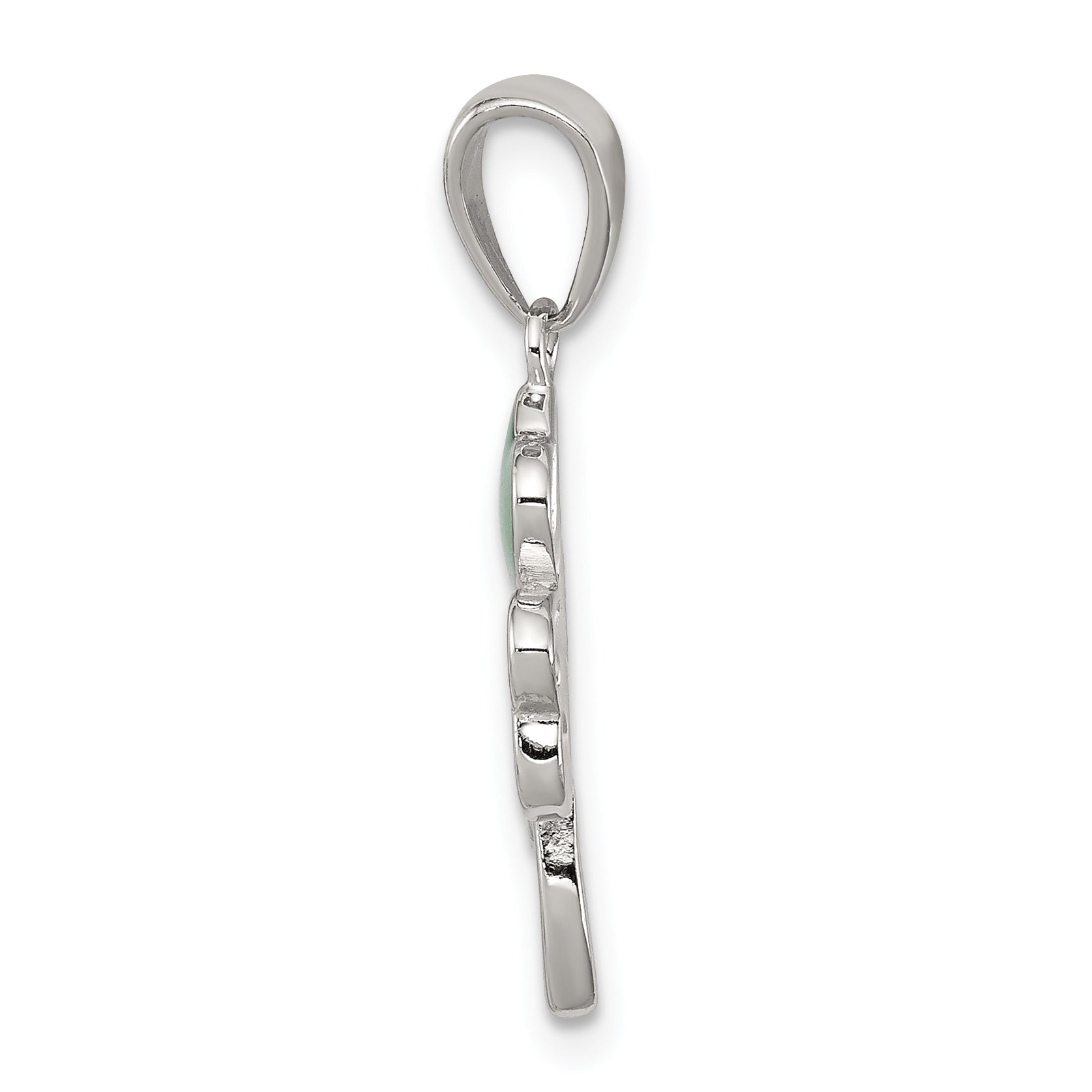 The Sterling Silver Rhodium-Plated Green Enameled Four Leaf Clover Pendant captures both elegance and luck. Made from 925 sterling silver, this shining piece showcases a vibrant green enamel finish, symbolizing fortune. At 24 mm in length, with a detailed clover charm measuring 17 mm by 11 mm, it makes a perfect addition to any jewelry collection. The pendant's polished finish enhances its beauty, attracting eyes with its reflective charm. The 3 mm bail allows easy attachment to your favorite chain. Add a touch of charm and sophistication to your outfit with the Sterling Silver Rhodium-Plated Green Enameled Four Leaf Clover Pendant.