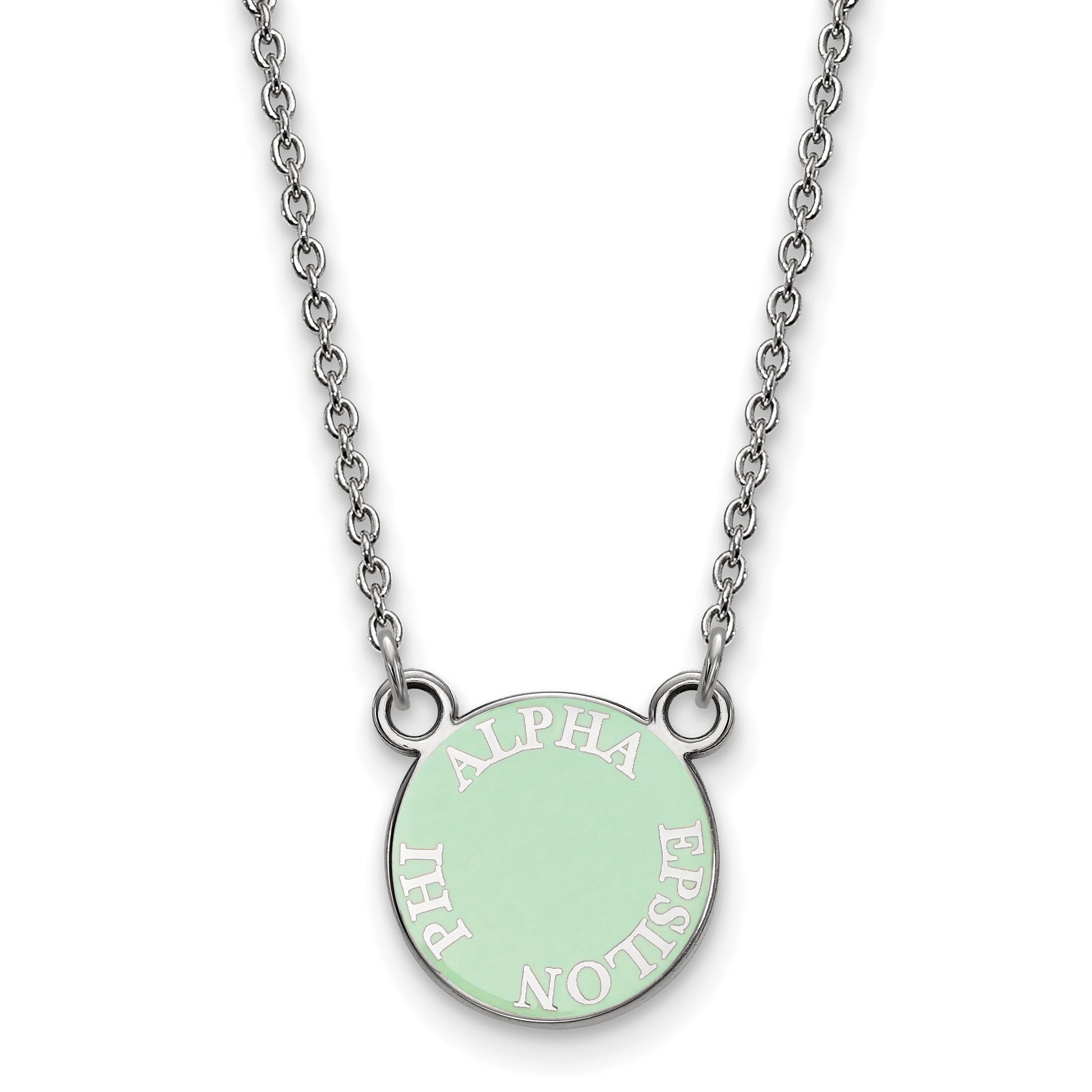The Sterling Silver Rhodium-Plated Logoart Alpha Epsilon Phi Extra Sorority Text Small Color Enamel Pendant is a sleek and stylish necklace perfect for showing your sorority pride. Crafted from high-quality 925 sterling silver, it features a polished finish and a vibrant green enamel accent. The 18-inch cable chain offers a comfortable fit, while the small charm measures 12 mm, making it a subtle yet meaningful piece. The pendant displays the Alpha Epsilon Phi logo boldly, celebrating your sisterhood. With laser-cut precision and durable rhodium plating, the Logoart Alpha Epsilon Phi necklace provides lasting shine and charm.