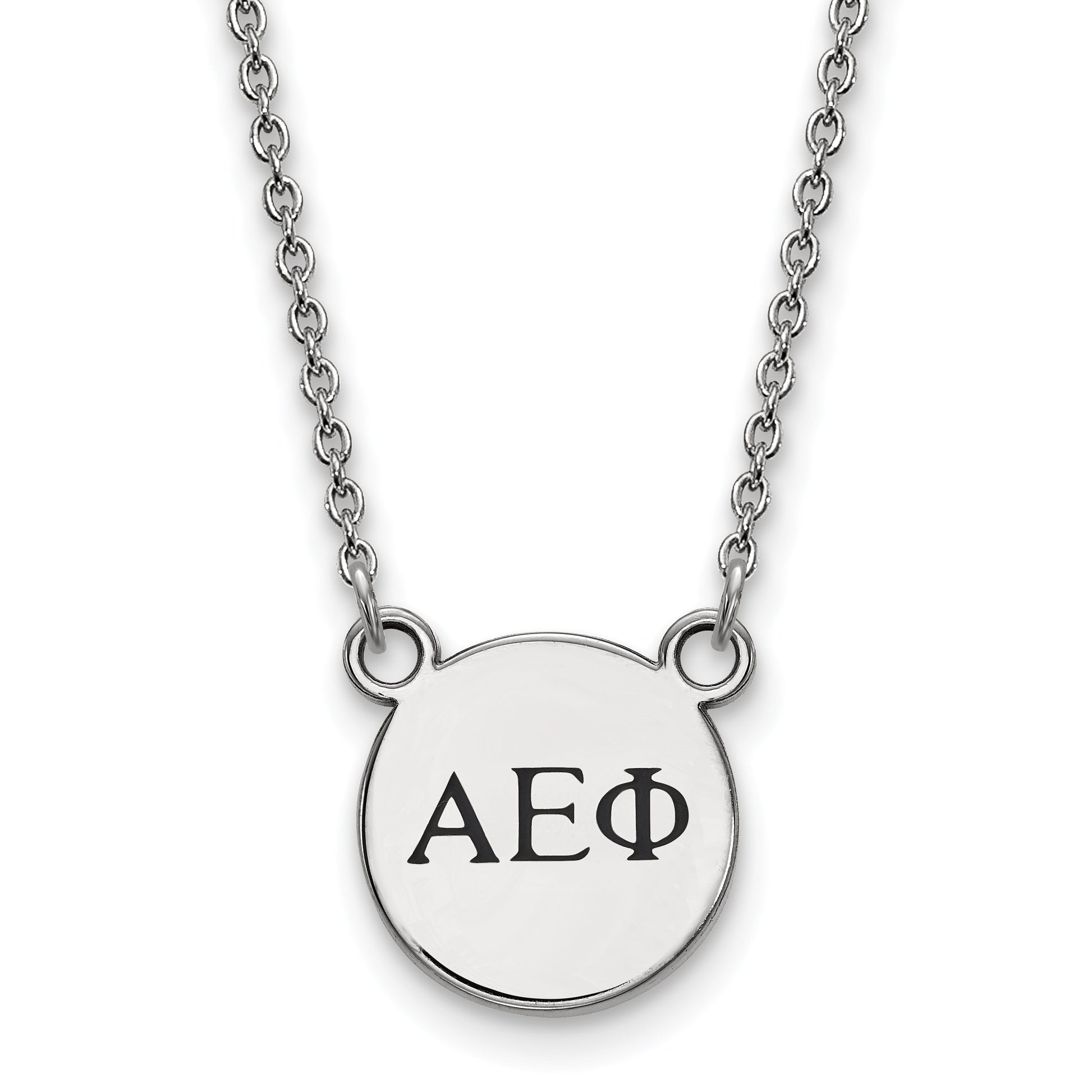Introducing the Sterling Silver Rhodium-Plated Logoart Alpha Epsilon Phi Sorority Greek Letters Pendant, crafted for true pride. This extra-small black enamel charm measures 12 mm and features a polished sterling silver finish with sleek rhodium plating for added shine. The black enamel accents give it a touch of bold style, perfect for daily wear. Suspended on a comfortable 18-inch cable chain, it’s ideal for both guys and girls who want subtle sorority flair. Designed with laser-cut precision, the Logoart Alpha Epsilon Phi Pendant makes a stylish statement of loyalty and sisterhood.