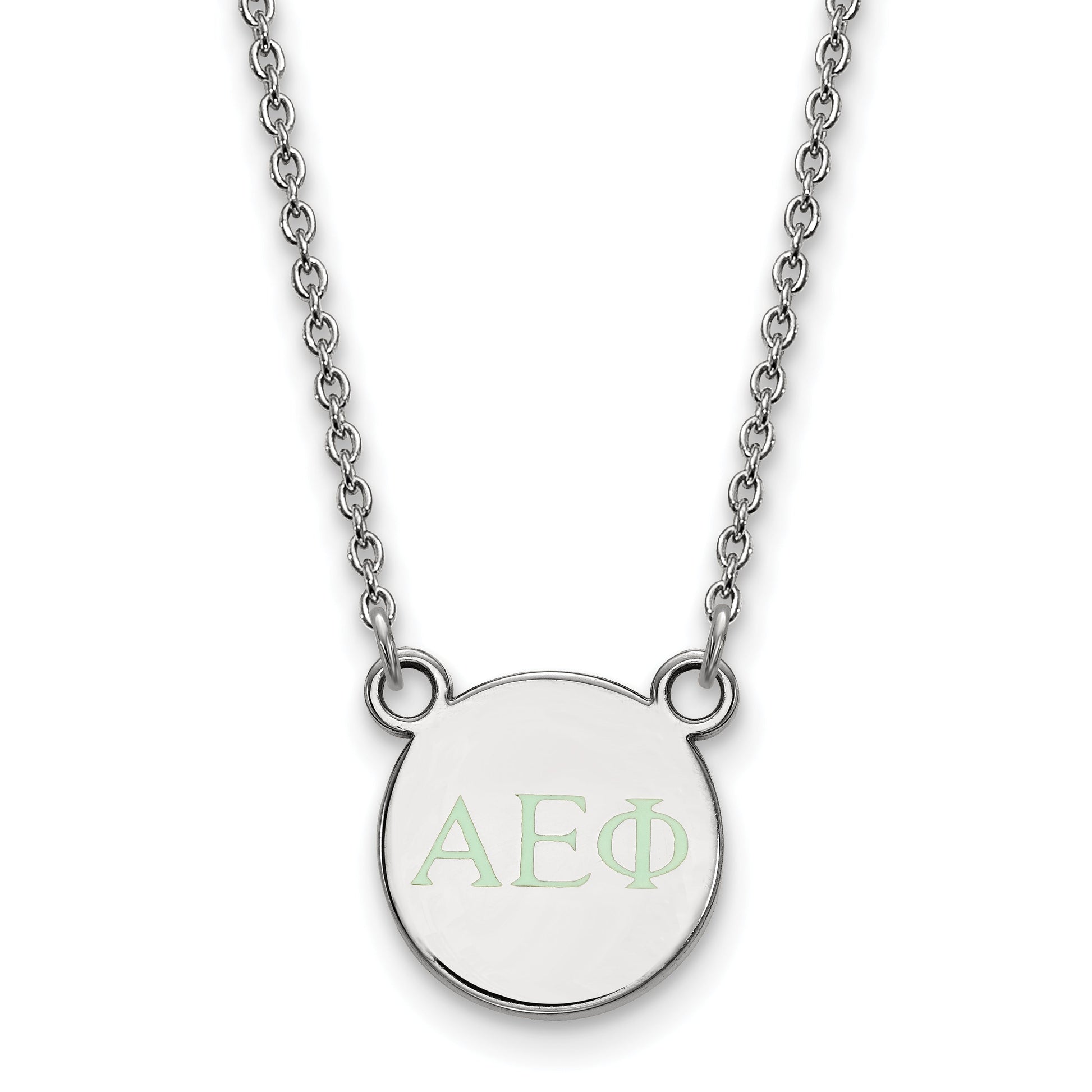 The Sterling Silver Rhodium-Plated Logoart Alpha Epsilon Phi Sorority Greek Letters Necklace is a true keepsake for sisters. Crafted from solid sterling silver with a smooth rhodium finish, it features vibrant green enamel accents that make the design pop. The 18-inch cable chain is lightweight and sits comfortably around your neck. The small, laser-cut charm measures 12 mm, making it a subtle yet meaningful addition to your jewelry collection. Perfect for everyday wear, the Logoart Alpha Epsilon Phi Necklace showcases your pride and sisterhood in a sleek, stylish way.
