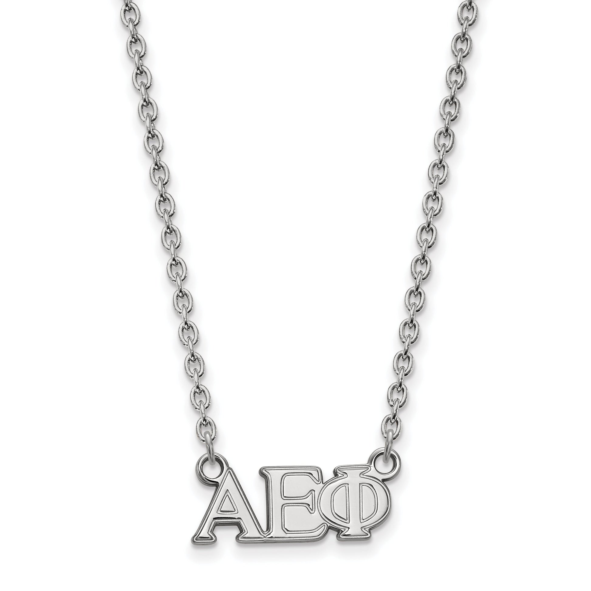 Show off your pride with the Sterling Silver Rhodium-Plated Logoart Alpha Epsilon Phi Sorority Greek Letters Medium Pendant Necklace. Crafted from high-quality 925 sterling silver, this necklace shines with a polished finish and features the iconic Greek letters laser cut for precision. The 18-inch cable chain with a lobster clasp keeps the pendant secure, making it perfect for everyday wear. Its medium size makes a bold statement without being bulky. Whether you're at a rush event or just want to show your sisterhood spirit, the Logoart Alpha Epsilon Phi necklace adds a stylish touch and real meaning to your jewelry collection.