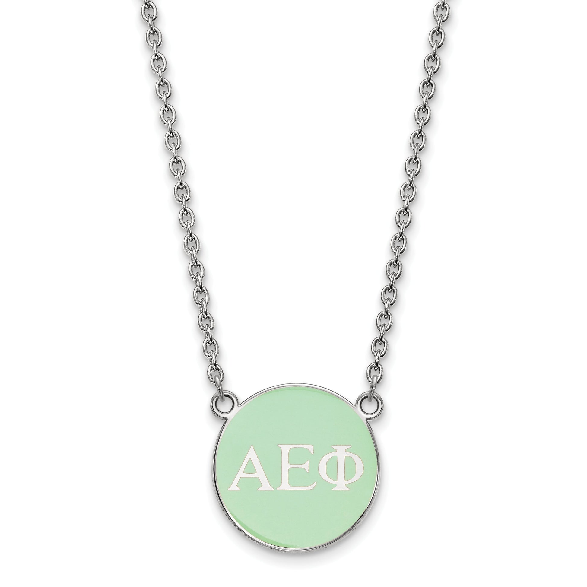 Discover the Sterling Silver Rhodium-Plated Logoart Alpha Epsilon Phi Greek Letters Pendant, a sleek piece for proud sorority ladies. Crafted from pure sterling silver, it features vibrant green enamel accents that make the letters pop. This petite 18-inch chain sits comfortably around your neck, perfect for daily wear. The laser-cut design ensures precise detail, while the rhodium plating adds a bright shine and keeps it looking new. Whether you’re heading to class or a casual get-together, the alpha epsilon phi pendant offers a subtle yet stylish way to show your pride. This necklace blends quality with charm, making it a must-have for your jewelry box.