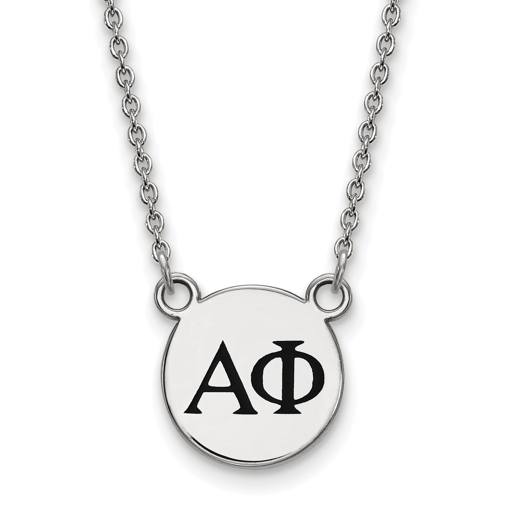Show off your pride with the Sterling Silver Rhodium-Plated Logoart Alpha Phi Sorority Greek Letters Small Black Enamel Pendant Necklace. Crafted from pure sterling silver, it features a sleek black enamel accent that adds a touch of style. The 18-inch cable chain offers a comfy fit and durable hold, perfect for daily wear. Laser-cut details give it crisp lines, making the Greek symbols stand out. The pendant is small but bold, a great way to celebrate your Alpha Phi sisterhood. The necklace's shimmering silver tone and black enamel appeal make it a true must-have for any Alpha Phi member.