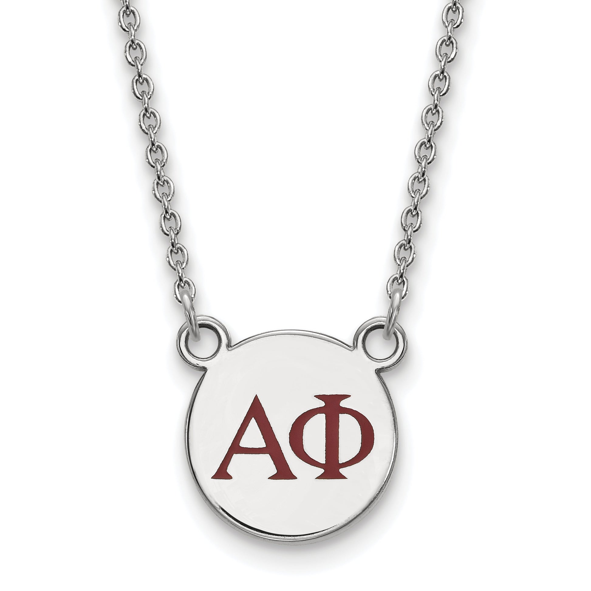 The Sterling Silver Rhodium-Plated Logoart Alpha Phi Sorority Greek Letters Small Color Enamel Pendant Necklace is a perfect piece for any proud sister. Crafted from high-quality 925 sterling silver and finished with a shiny rhodium coat, it offers durability and style. The small, vibrant enamel charm highlights the Alpha Phi Greek letters in bold Bordeaux color. The 18-inch cable chain adds just the right length for everyday wear. Light and easy to style, this necklace makes a great gift or personal keepsake. The Logoart Alpha Phi necklace is a true symbol of sisterhood and pride.