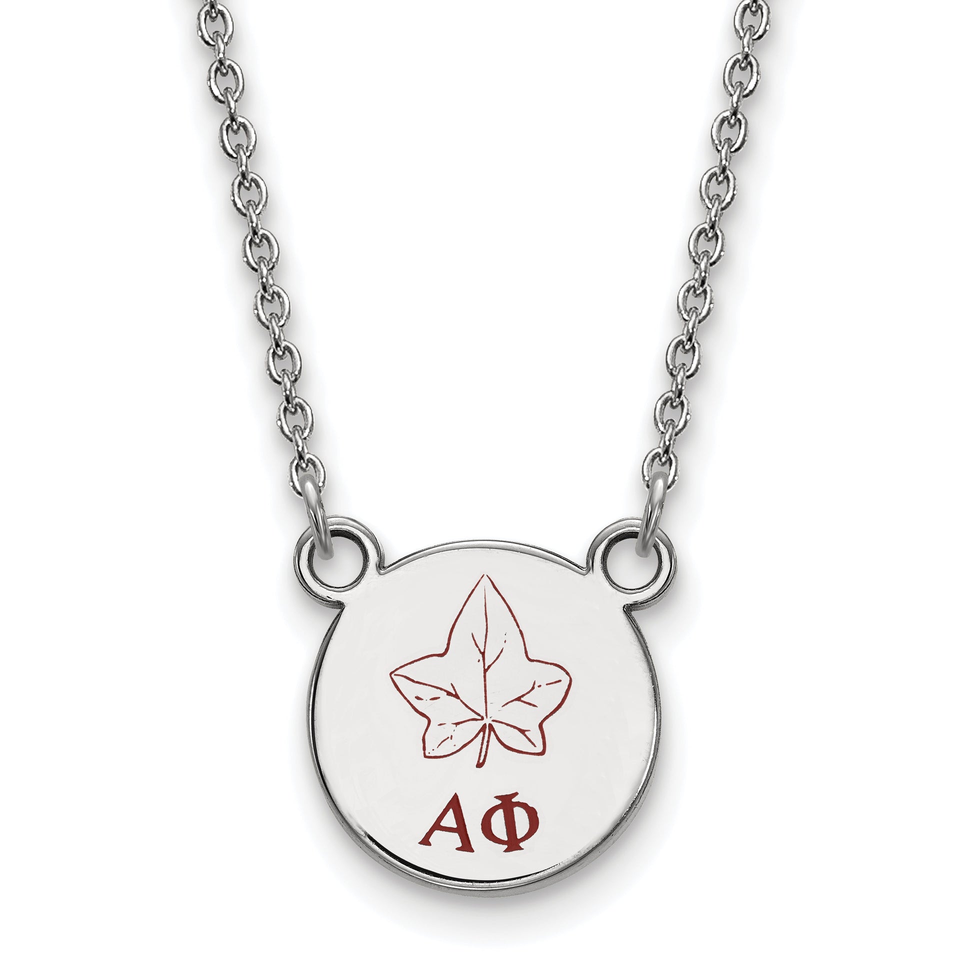 The Sterling Silver Rhodium-Plated LogoArt Alpha Phi Sorority Symbol Necklace is a sleek and stylish piece that shows pride in your sorority. Made from pure sterling silver, it features a vibrant Bordeaux enamel accent on the small charm, which measures 12 mm in both length and width. The necklace is 18 inches long with a sturdy cable chain and a lobster clasp, offering a comfortable fit. Its polished finish and laser-cut design make it a sharp, eye-catching piece. The LogoArt Alpha Phi necklace is a simple way to wear your sorority spirit every day.