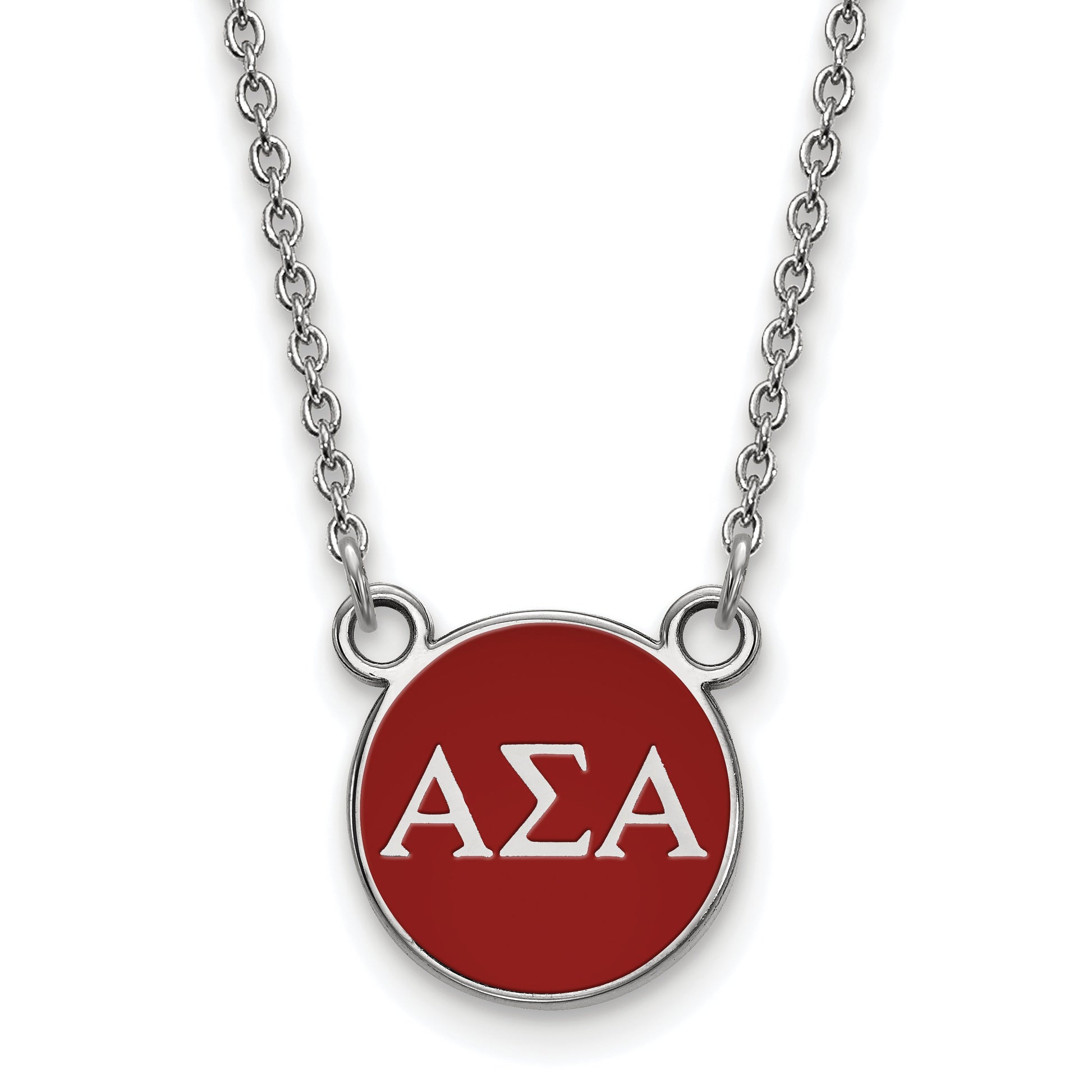 The Sterling Silver Rhodium-Plated Logoart Alpha Sigma Sorority Greek Letters Necklace is a sleek piece that shows your pride. Crafted from high-quality 925 silver, it features a colorful enamel charm in royal purple and gold accents. The 18-inch cable chain is lightweight and sturdy, perfect for everyday wear. The laser-cut design offers a clean, sharp look that highlights the Greek letters for Alpha Sigma Sigma. This small pendant makes a great gift or personal keepsake, combining stylish shine with meaningful symbolism. The Sterling Silver Rhodium-Plated Logoart Alpha Sigma Sorority Necklace is a simple yet eye-catching addition to any jewelry collection.