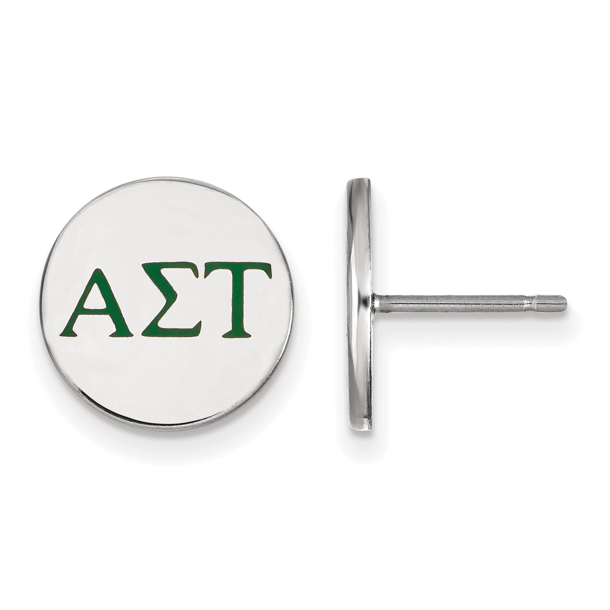 Show your pride with the Sterling Silver Rhodium-Plated Logoart Alpha Sigma Tau Sorority Greek Letters Earrings. Crafted from pure sterling silver and coated with shiny rhodium, these earrings offer a sleek, polished look. The small, 12-mm button-style earrings feature vibrant green enamel accents that add a pop of color. Designed for women, they are lightweight and easy to wear with a simple post and push-back closure. Perfect for everyday wear or special occasions, these earrings celebrate your sorority bond. The Sterling Silver Rhodium-Plated Logoart Alpha Sigma Tau Earrings combine quality, style, and true sisterhood in one stunning piece.