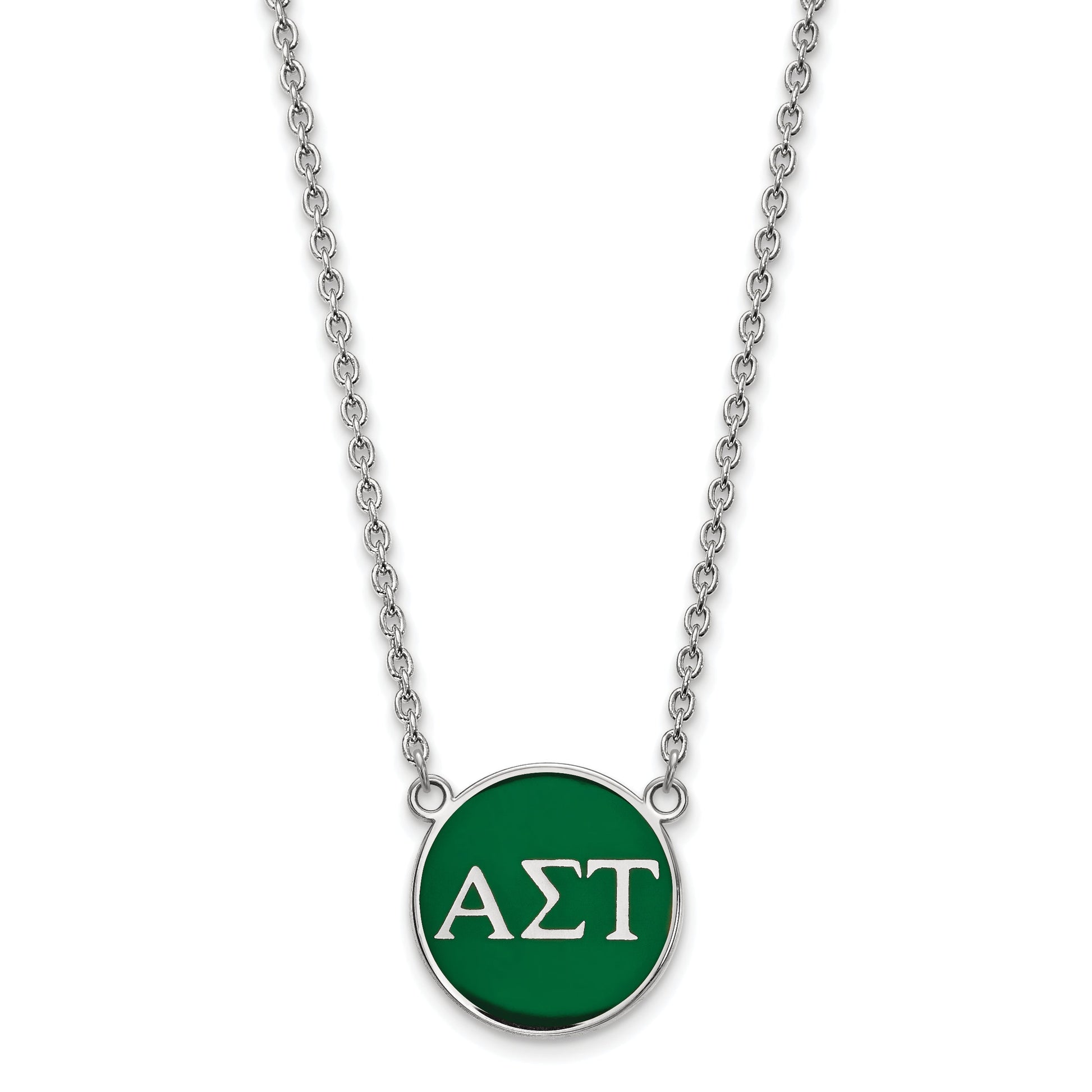 Show off your pride with the Sterling Silver Rhodium-Plated Alpha Sigma Tau Greek Letters Pendant. This bold necklace features large enamel-colored letters that stand out and make a statement. Made from pure 925 sterling silver with a shiny polished finish, it’s built to last. The vibrant emerald accent adds a splash of color, while the 18-inch cable chain lets you wear it comfortably. The logo is laser-cut for precision and finished with a durable rhodium plate. Perfect for members of Alpha Sigma Tau, the Sterling Silver Rhodium-Plated Greek Letters Pendant blends quality with pride in every wear.