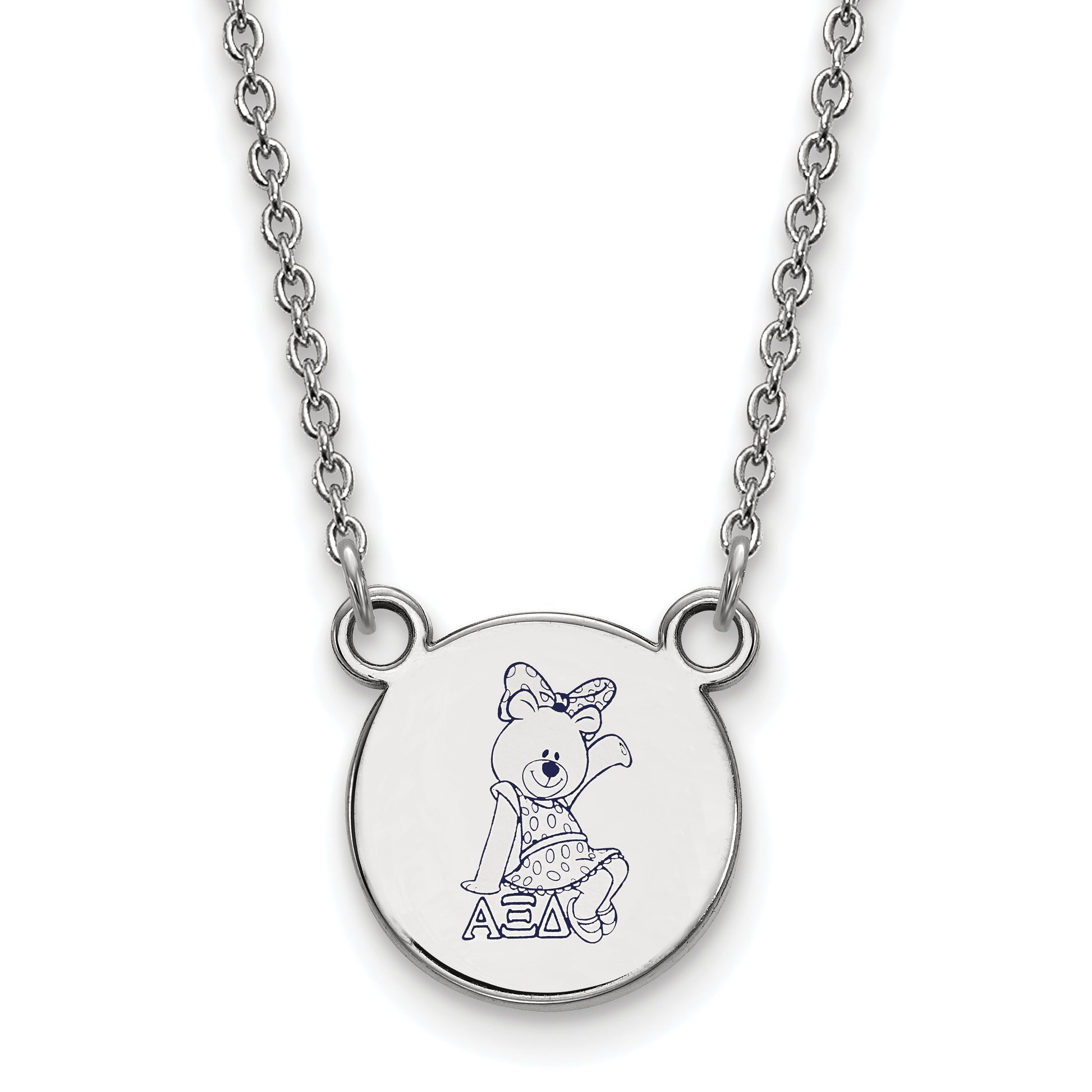 Show your sisterhood with the LogoArt Alpha Xi Delta Sorority Pendant on this sleek 18-inch chain. Made from bright sterling silver and coated with rhodium for extra shine, the pendant features the sorority's alpha Xi Delta logo with vibrant blue enamel accents. Measuring just 12 mm, it’s a subtle yet bold symbol of pride. The cable chain is sturdy and comfortable, with a lobster clasp that keeps it secure. The LogoArt Alpha Xi Delta Sorority Necklace is perfect for everyday wear or special events, letting you display your pride with style.