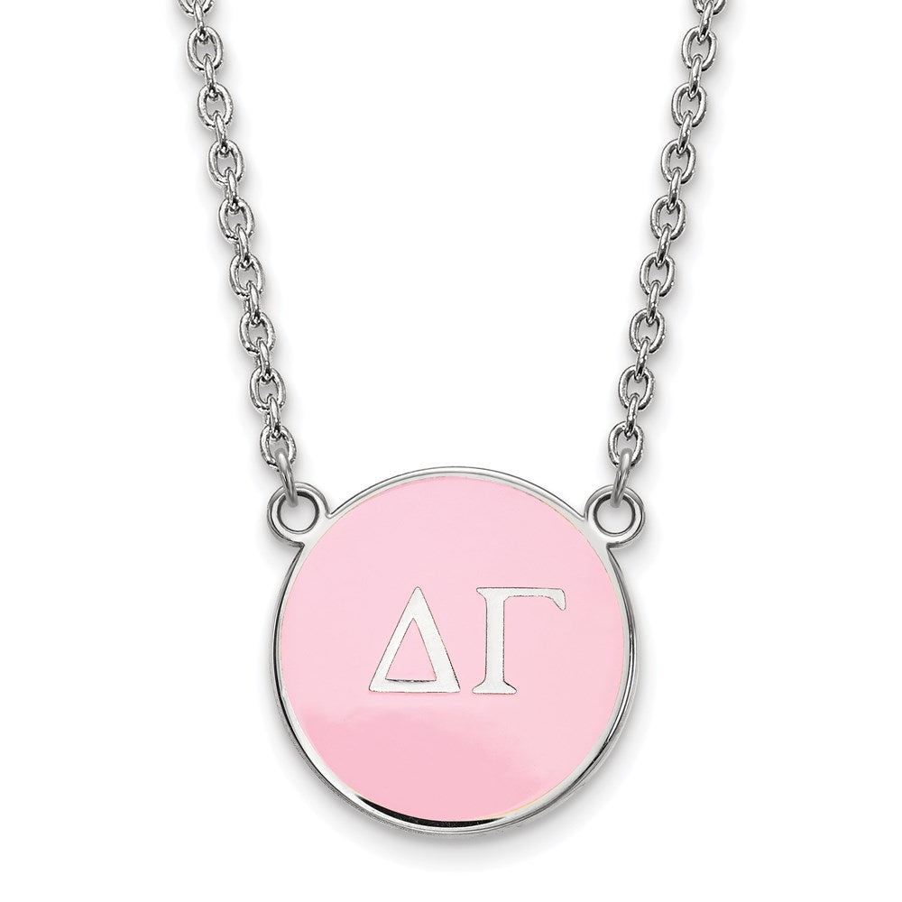 Show your pride with the Logoart Delta Gamma Greek Letters Necklace. Crafted from high-quality sterling silver, this large enamel pendant features vibrant blue accents and a polished rhodium finish that resists tarnish. The 18-inch cable chain comfortably drapes around your neck, making it perfect for daily wear or special moments. Laser-cut for precision, the pendant measures 19 mm in both width and height, highlighting your sorority spirit with style. This Logoart necklace is a real keeper, blending bold design with lasting quality from Logoart LLC, licensed by Delta Gamma.