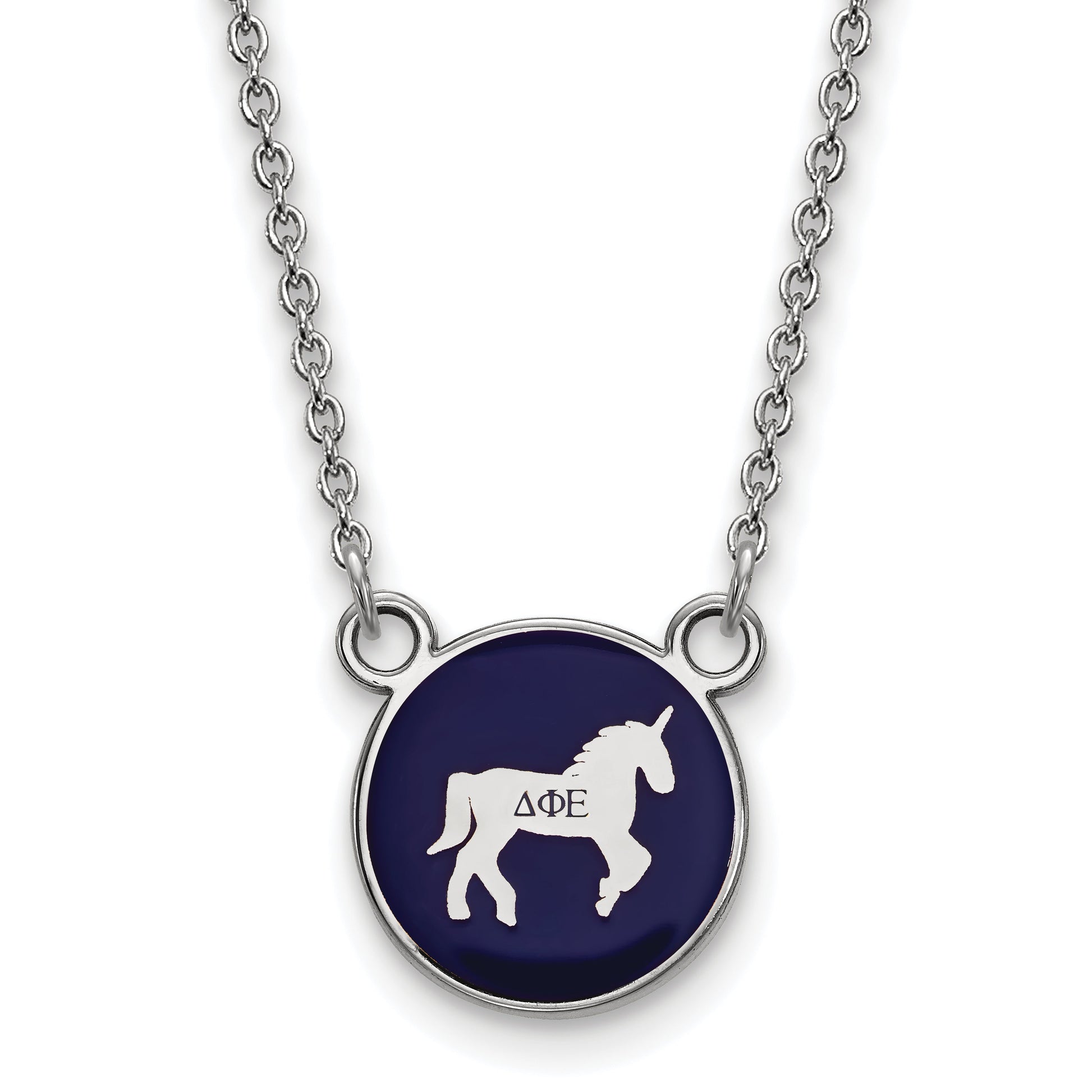 The Sterling Silver Rhodium-Plated Logoart Delta Phi Epsilon Sorority Symbol Necklace offers a stylish way to show your pride. Crafted from high-quality 925 sterling silver, this 18-inch cable chain features a small, eye-catching enamel pendant in royal purple and gold accents. The pendant measures 12 mm and is laser cut for fine detail, giving it a sharp look. Its rhodium plating adds a shiny, durable finish, perfect for daily wear. The lobster clasp keeps the necklace secure, while the compact design makes it ideal for any outfit. Wear this Logoart Delta Phi Epsilon necklace to celebrate your sisterhood with style.