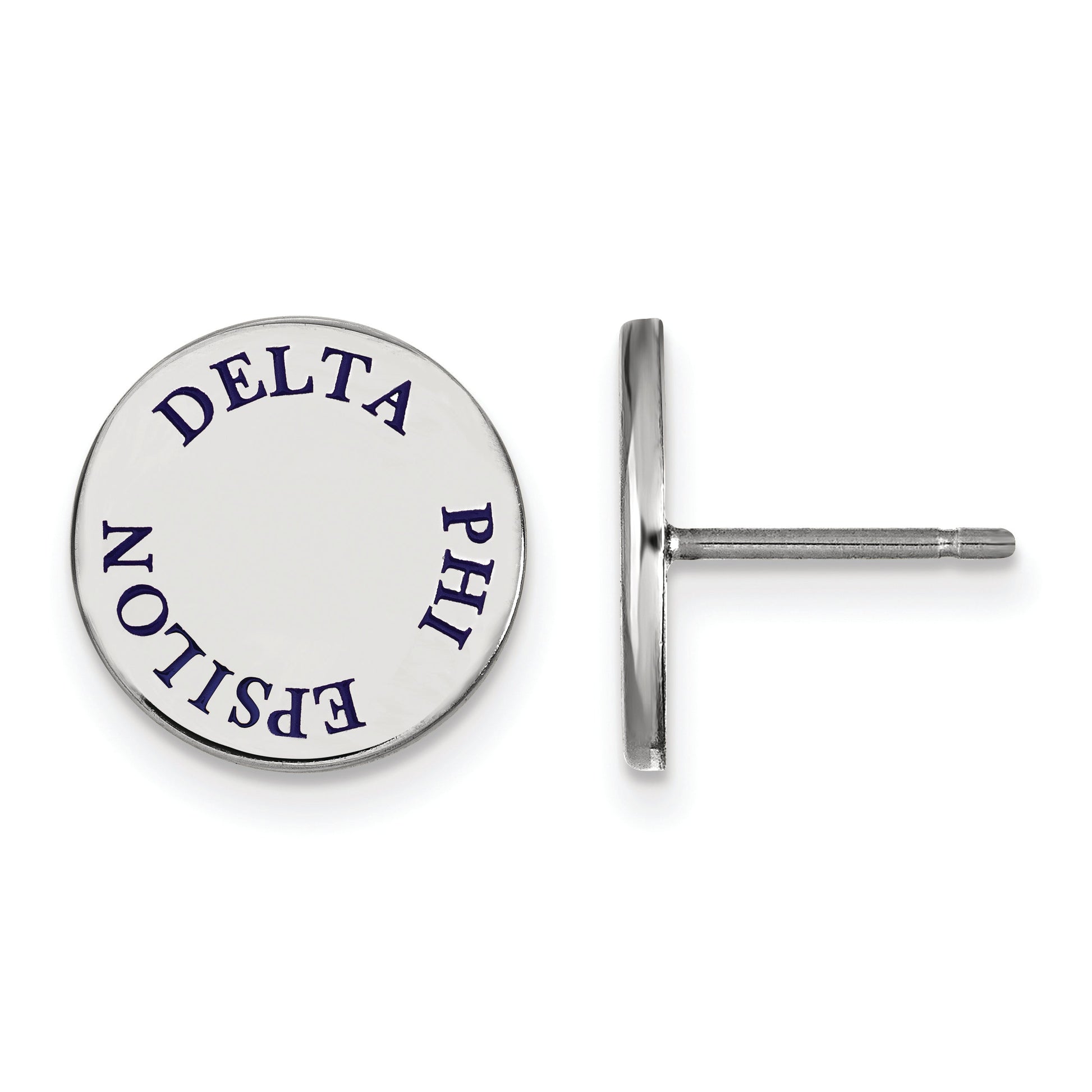The Sterling Silver Rhodium-Plated Logoart Delta Phi Epsilon Sorority Text Color Enamel Post Earrings are a stylish way to show sorority pride. These earrings are made from high-quality sterling silver with a shiny rhodium finish, ensuring durability and a sleek look. Each pair features a small 12 mm button design with vibrant purple and gold enamel accents that highlight the Delta Phi Epsilon logo. The post and push-back closure offer easy wear for women who want to add a pop of color and meaning to their jewelry collection. These earrings blend elegance with a sense of belonging, making them a perfect gift or special accessory.