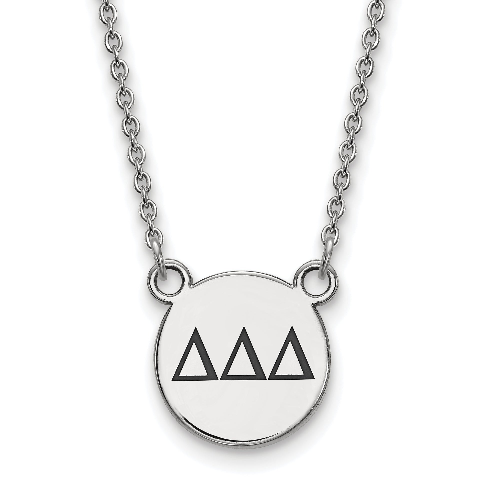 Show off your school pride with the Sterling Silver Rhodium-Plated Logoart Delta Sorority Greek Letters Small Black Enamel Pendant Necklace. This 18-inch chain features a sleek pendant that combines sterling silver with a durable rhodium finish for lasting shine. The black enamel accents add a bold touch, making it a versatile piece for everyday wear. With a laser-cut design, the pendant is lightweight yet stylish, perfect for any outfit. Whether you're part of Delta Delta Delta or want a meaningful gift, the Logoart Delta Sorority Necklace is a must-have.