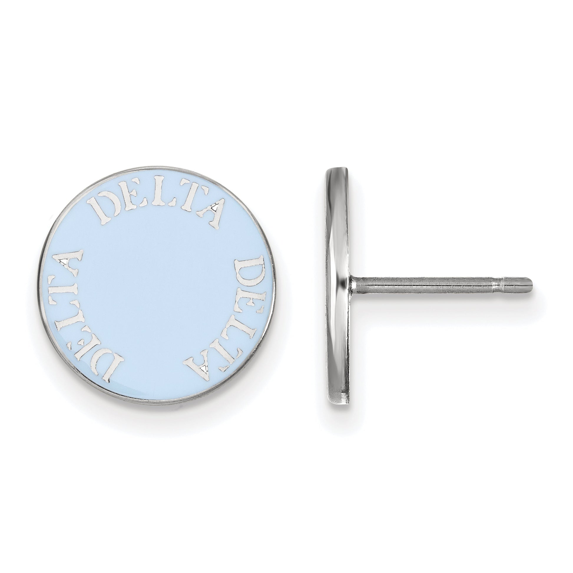 The Sterling Silver Rhodium-Plated Logoart Delta Sorority Text Color Enamel Post Earrings are a chic choice for any sorority woman. These 12 mm button earrings feature a polished finish that shines bright. Crafted from high-quality sterling silver, they are coated with rhodium to resist tarnish and add a sleek silver tone. The earrings display vibrant cerulean and gold enamel accents with the Delta Delta Delta logo, all laser-cut for precision. With a secure post and push-back closure, these earrings are lightweight and easy to wear. Show your sisterhood spirit with these stylish earrings, perfect for daily wear or special events.