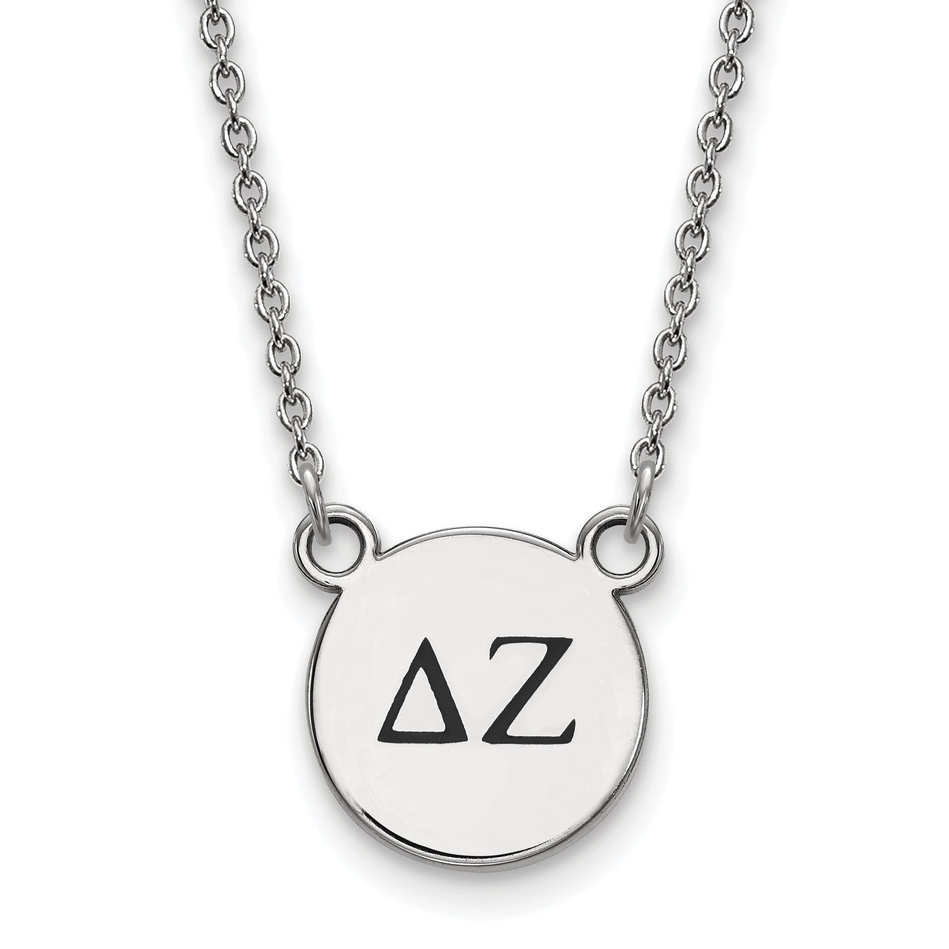 Show your Greek pride with the LogoArt Delta Zeta sorority necklace. Made from sterling silver, this 18-inch chain features a small, sleek pendant that showcases the Delta Zeta Greek letters. The pendant is coated in rhodium for a bright shine and finished with black enamel accents for a bold look. Its laser-cut design ensures a clean, precise fit, while the lobster clasp keeps it secure. Perfect for any Delta Zeta member, this unisex necklace combines style and meaning in one small, polished piece. Stand out and celebrate your sisterhood with the LogoArt Delta Zeta Greek Letters pendant.
