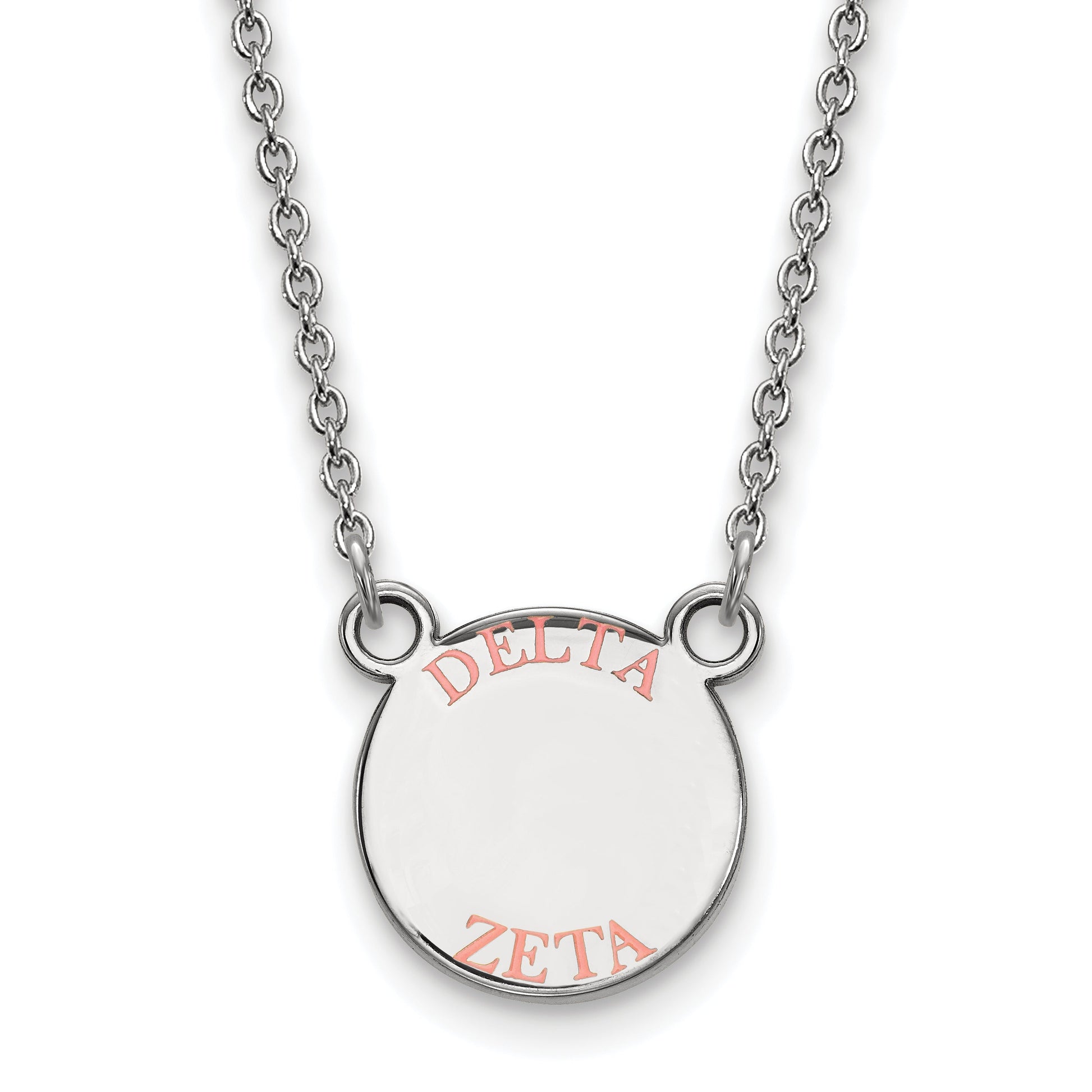 Show your pride with the LogoArt Delta Zeta Sorority Small Enamel Pendant Necklace. Crafted from genuine sterling silver, this 18-inch chain features a sleek rhodium plating that resists tarnish and adds shine. The pendant showcases the Delta Zeta logo in vibrant pink and green enamel, making it stand out. Its compact size of 12mm offers a subtle yet stylish look perfect for everyday wear. The sturdy lobster clasp ensures it stays secure, while the polished finish gives it a smooth feel. The LogoArt Delta Zeta necklace is a must-have piece to celebrate your sorority roots.