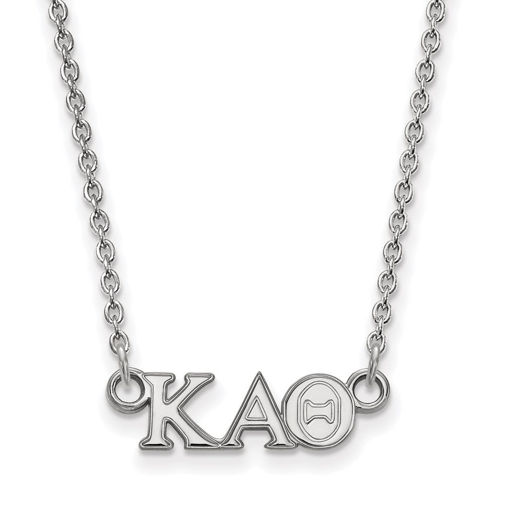 The Sterling Silver Rhodium-Plated Logoart Kappa Alpha Theta Necklace is a perfect piece for any member of the sorority. This extra-small pendant features the iconic Greek letters, which stand out with a polished, silver-tone shine. Made from pure sterling silver, it’s durable and lightweight, ideal for daily wear. The 18-inch cable chain adds a comfortable fit, and the lobster clasp keeps it secure. Designed with laser-cut precision and a sleek rhodium finish, this necklace highlights your pride and style. The Sterling Silver Rhodium-Plated Logoart Kappa Alpha Theta Necklace is a small but meaningful way to celebrate your sorority connection.