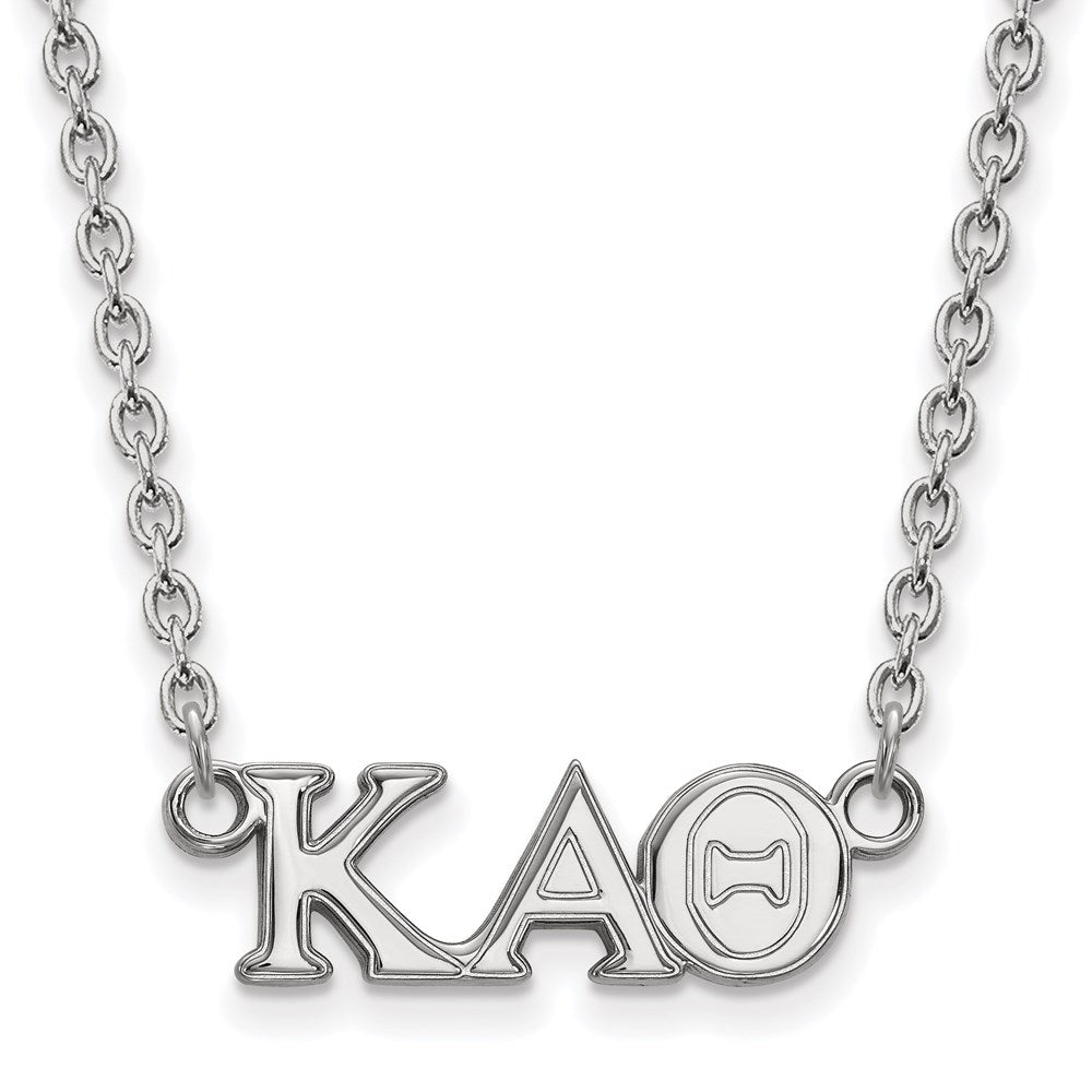 Show off your sorority pride with the Sterling Silver Rhodium-Plated Logoart Kappa Alpha Theta Medium Pendant Necklace. This necklace features the iconic Greek letters crafted from high-quality sterling silver and finished with a sleek rhodium coating that resists tarnish. The pendant measures 20 mm and hangs on an 18-inch cable chain with a sturdy lobster clasp for easy wear. Perfect for everyday wear or special events, the logo jewelry captures the spirit of Kappa Alpha Theta. Make your style stand out with the Signature Logoart Kappa Alpha Theta Necklace, a true symbol of sisterhood and pride.