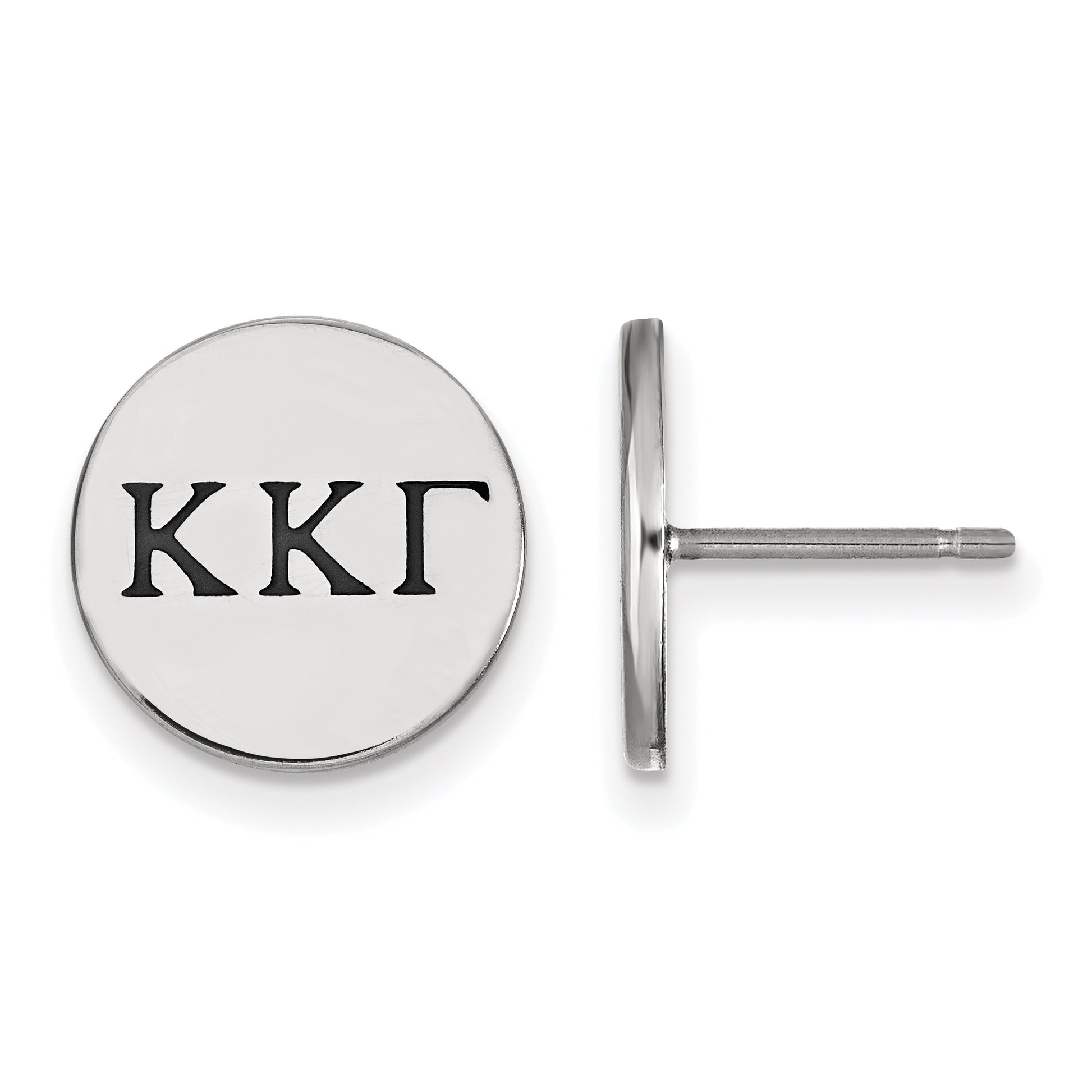 The Sterling Silver Rhodium-Plated Logoart Kappa Gamma Sorority Greek Letters Black Enamel Post Earrings are a stylish way for women to show their pride. Crafted from high-quality sterling silver with a polished finish, these earrings measure 12 mm and feature striking black enamel accents. The blue highlights add a pop of color, making them stand out. Designed with a secure post and push-back closure, they are comfortable for everyday wear. These earrings are laser cut, ensuring precise detail and durability. Perfect for any Kappa Gamma member, the Logoart Kappa Gamma Sorority Earrings combine sleek style with meaningful symbolism.