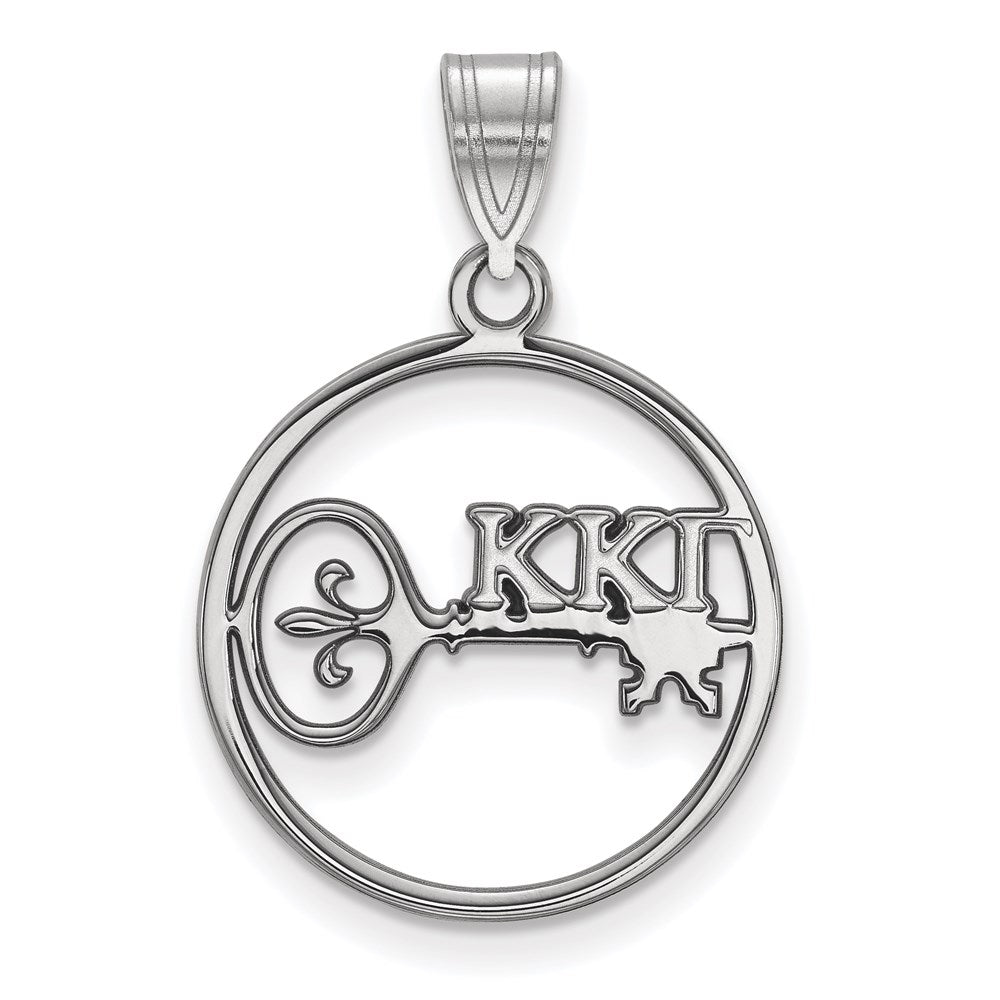 The Sterling Silver Rhodium-Plated Logoart Kappa Gamma Sorority Symbol Medium Circle Pendant offers a stylish way to show your pride. Crafted from 925 sterling silver with a high-polish finish, it features the iconic Kappa Gamma logo laser-cut into a sleek circle shape. The rhodium plating enhances its shine and durability. Measuring 25 mm in length with a 19 mm charm, it sits comfortably on a chain. Perfect for daily wear, this pendant is a great way to showcase your sorority spirit. The Logoart Kappa Gamma pendant is a must-have for any proud sister.