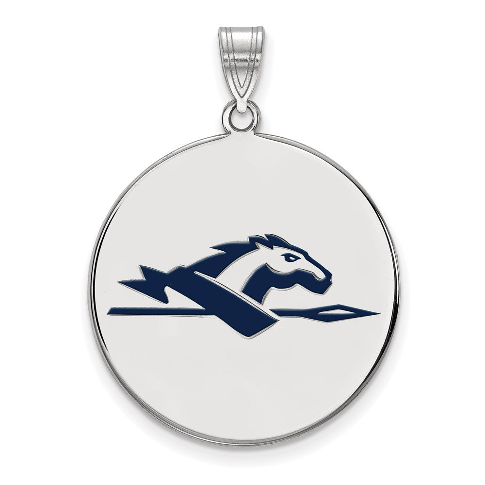 Celebrate your school spirit with the LogoArt Longwood University Horse Pendant. Crafted from high-quality 925 sterling silver with a polished finish, this large enameled disc measures 32mm and features a vivid school logo. The rhodium plating offers extra shine and durability, while the laser-cut design adds detail. The pendant's sizable charm, 26mm by 25mm, hangs from a sturdy 6mm bail. Perfect for showing off your pride, the LogoArt Longwood University Horse Pendant combines style and strength in one eye-catching piece.