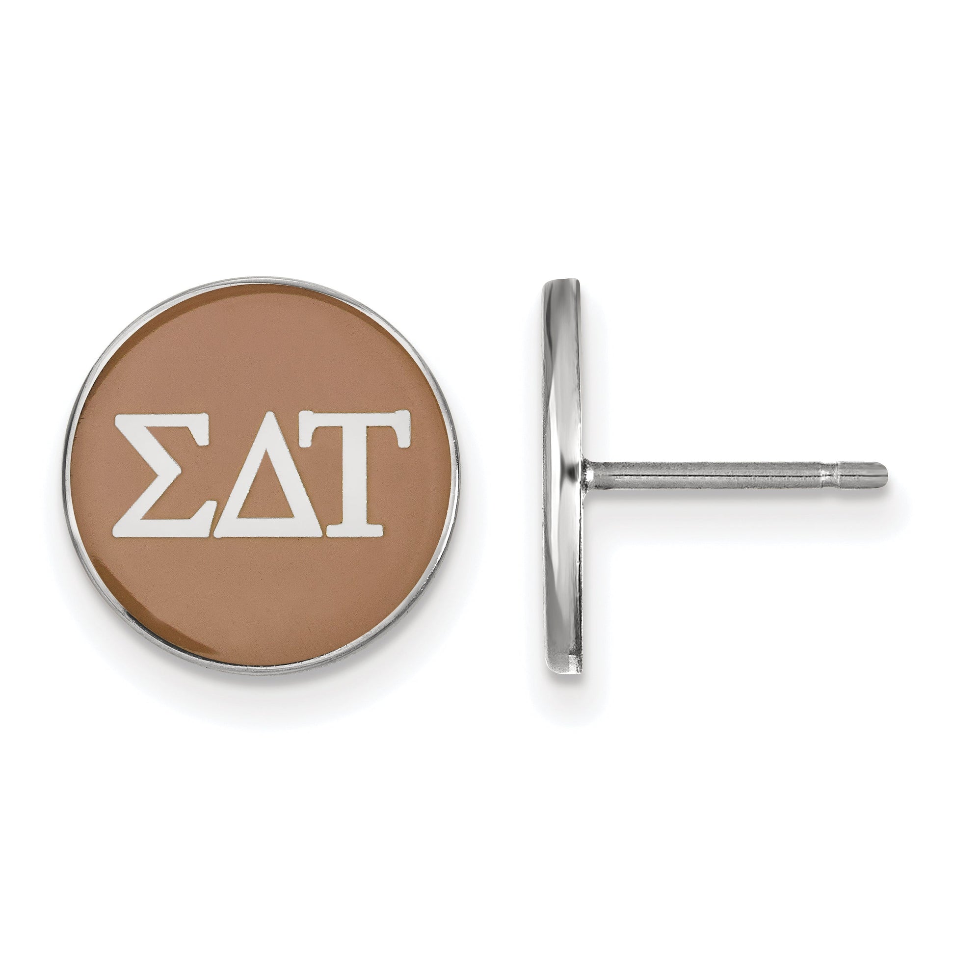 The Sterling Silver Rhodium-Plated Logoart Sigma Delta Tau Sorority Greek Letters Enamel Post Earrings are a stylish way to show pride. Made of pure sterling silver, they are polished for a bright shine. The earrings measure 12 mm and fit comfortably. They feature bold Greek letters with a touch of enamel color in Cafe Au Lait and blue. The post and push back closure makes for easy wear. These small, eye-catching earrings are perfect for any woman who wants to display her Sigma Delta Tau pride with class. They come from LogoArt LLC, ensuring quality and authenticity.