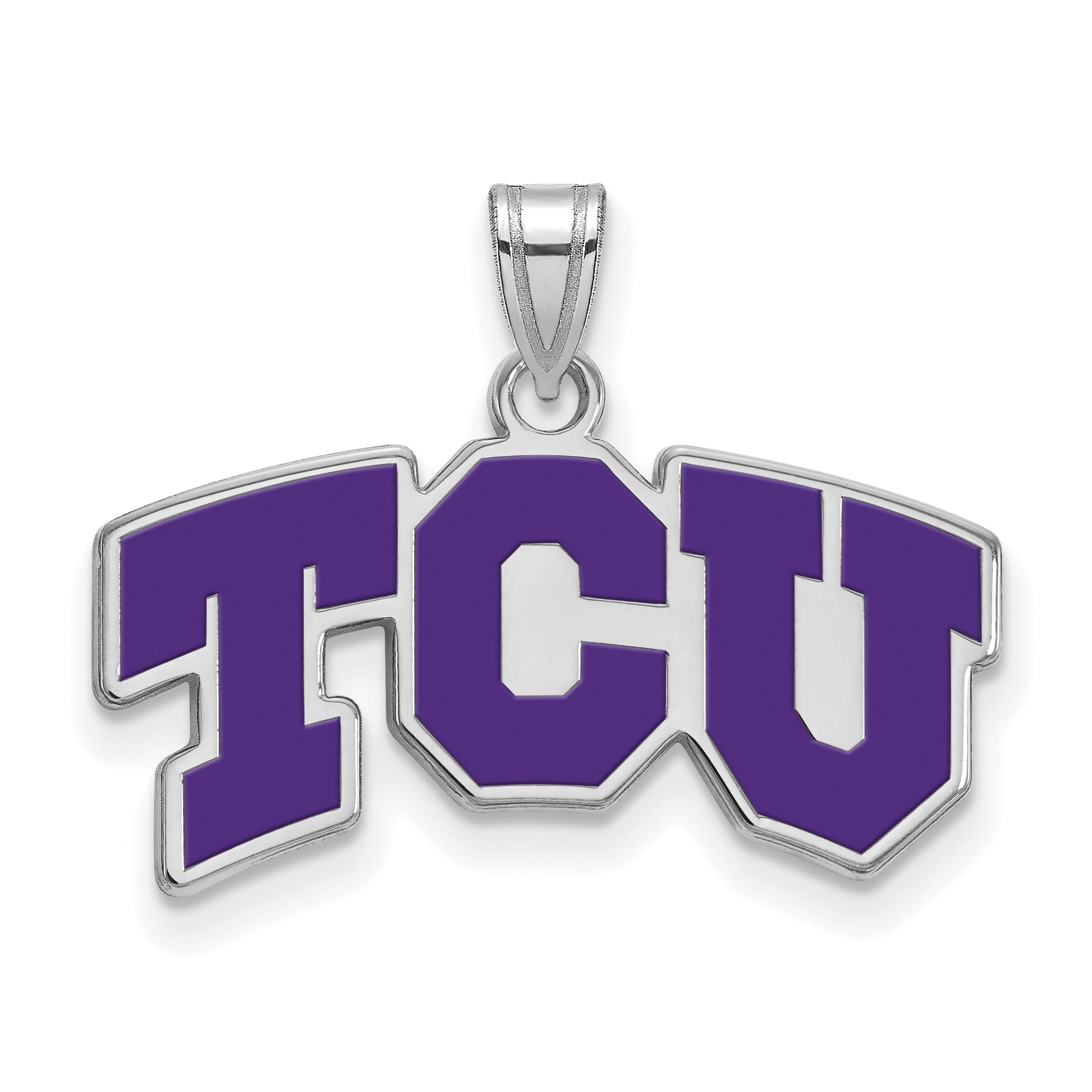 Show off your school pride with the Sterling Silver Rhodium-Plated LogoArt Texas Christian University T-C-U Small Enameled Pendant. Crafted from high-quality sterling silver, this pendant measures 18 mm and features a sleek polished finish. The TCU logo is beautifully enameled in bright colors, making it stand out. Its rhodium plating adds a shiny, durable coating that resists tarnish. The small size is perfect for everyday wear and fits easily on any chain. Whether you're a student or alum, the Texas Christian University T-C-U Small Enameled Pendant keeps your team spirit close.