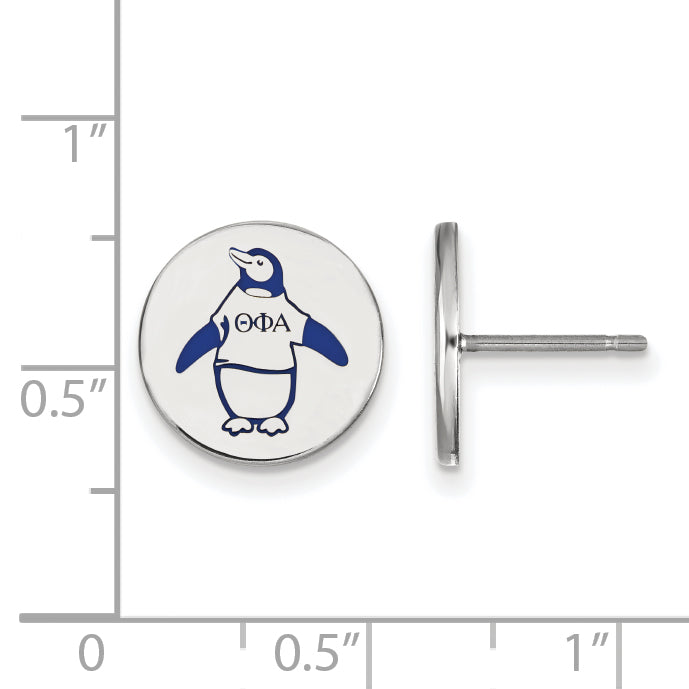 The Sterling Silver Rhodium-Plated Logoart Theta Phi Alpha Sorority Symbol Color Enamel Post Earrings offer a subtle touch of elegance for women. Crafted from high-quality sterling silver, these earrings are polished for a sleek look. They feature the recognizable Theta Phi Alpha logo in vibrant blue and gold enamel, making them perfect for showing your sorority pride. The earrings are small, just 12 mm wide, and easy to wear with a secure post and push back closure. Ideal for everyday wear or special events, the Sterling Silver Rhodium-Plated Logoart Theta Phi Alpha Sorority Symbol Color Enamel Post Earrings combine style and meaning in a simple, timeless design.