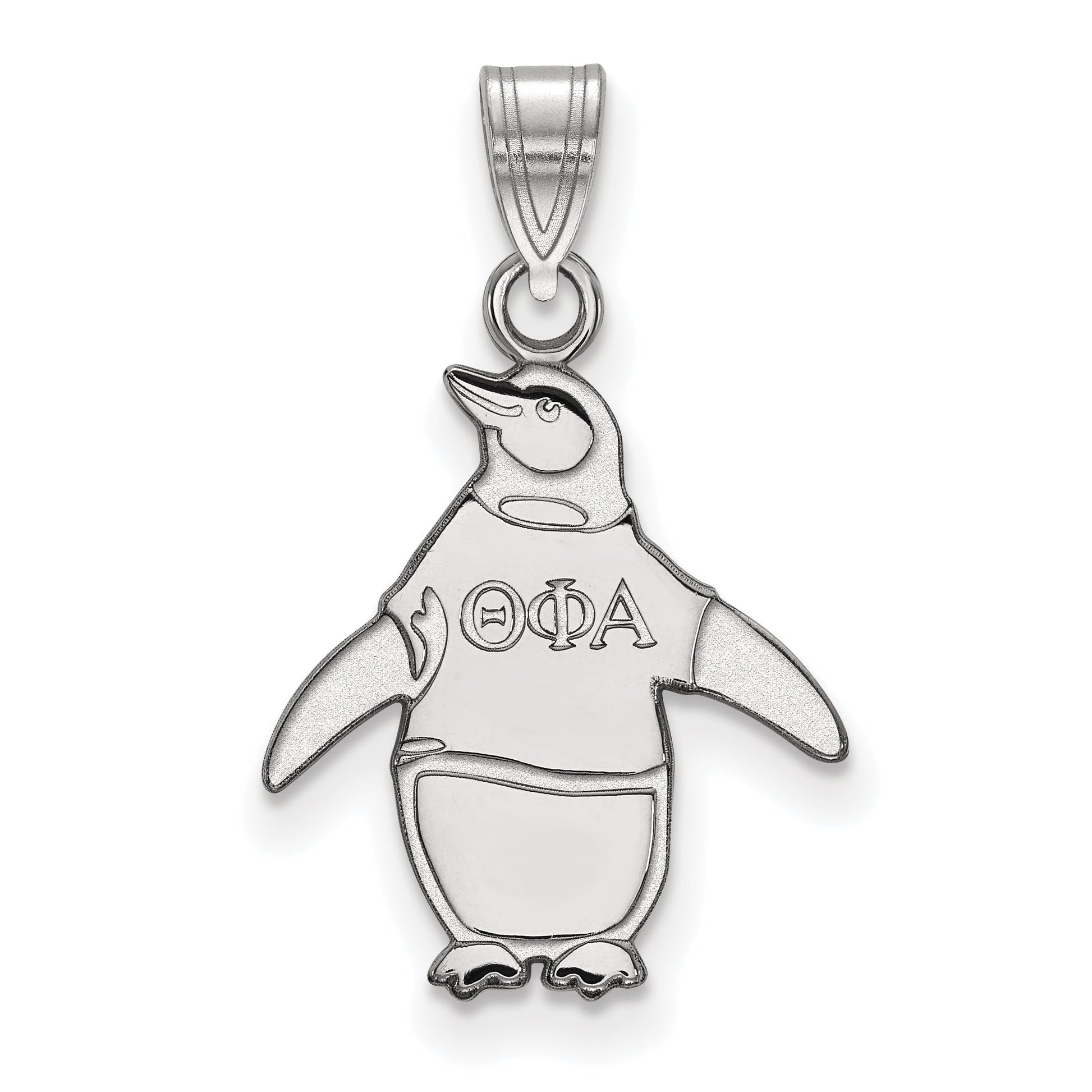 Celebrate your sorority pride with the Sterling Silver Rhodium-Plated Logoart Theta Phi Alpha Socoity Small Pendant. Crafted from high-quality 925 sterling silver, this charm features a sleek polished finish that gleams with elegance. The laser-cut design depicts the Theta Phi Alpha logo, making it a meaningful piece for any member. The pendant measures 22mm long and 15mm wide, with a small bail that easily attaches to your favorite chain. Whether for daily wear or special occasions, this pendant offers a subtle way to showcase your proud sorority ties.