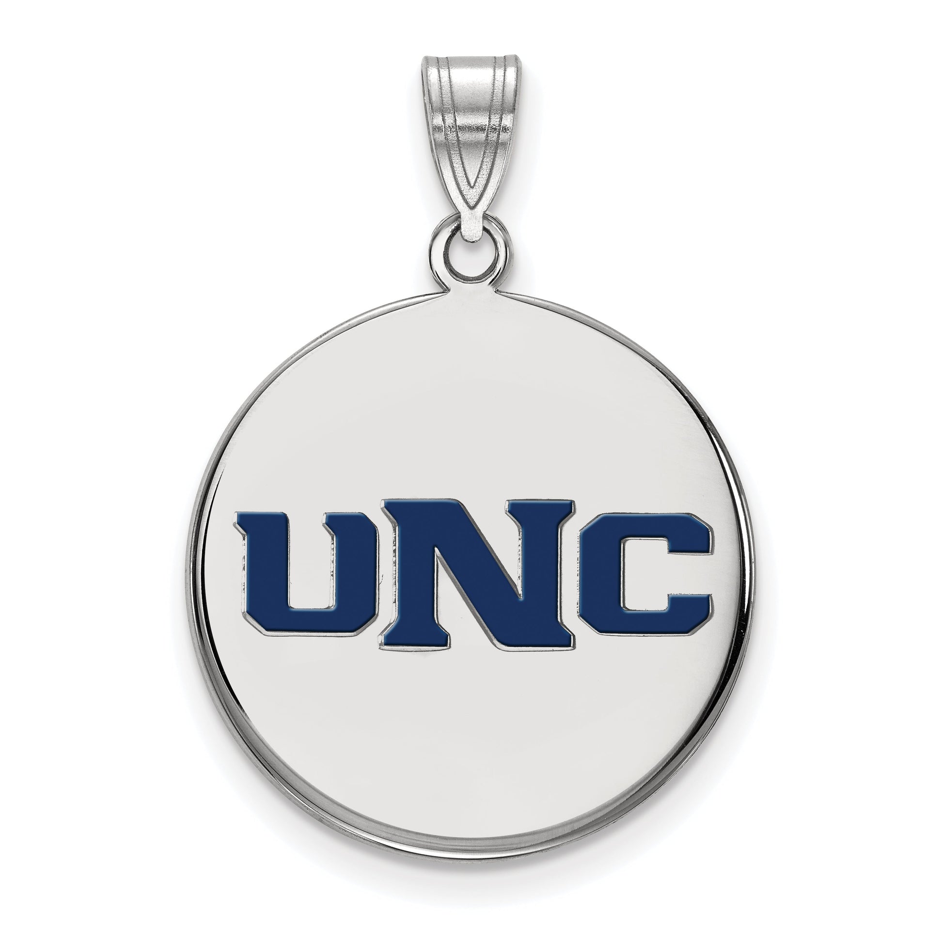 Show your school pride with the Sterling Silver Rhodium-Plated Logoart U of Northern Colorado U-N-C Large Enameled Disc Pendant. Crafted from high-quality 925 sterling silver, this bold pendant features a polished finish that catches the light. Its large 28mm size makes a striking statement and showcases the vibrant enameled UNC logo. The rhodium plating adds extra shine and durability, making it a perfect accessory for fans and alumni. Designed with laser-cut precision, the pendant is lightweight yet sturdy. Celebrate your Colorado roots with this stylish piece, a must-have for any Northern Colorado supporter.