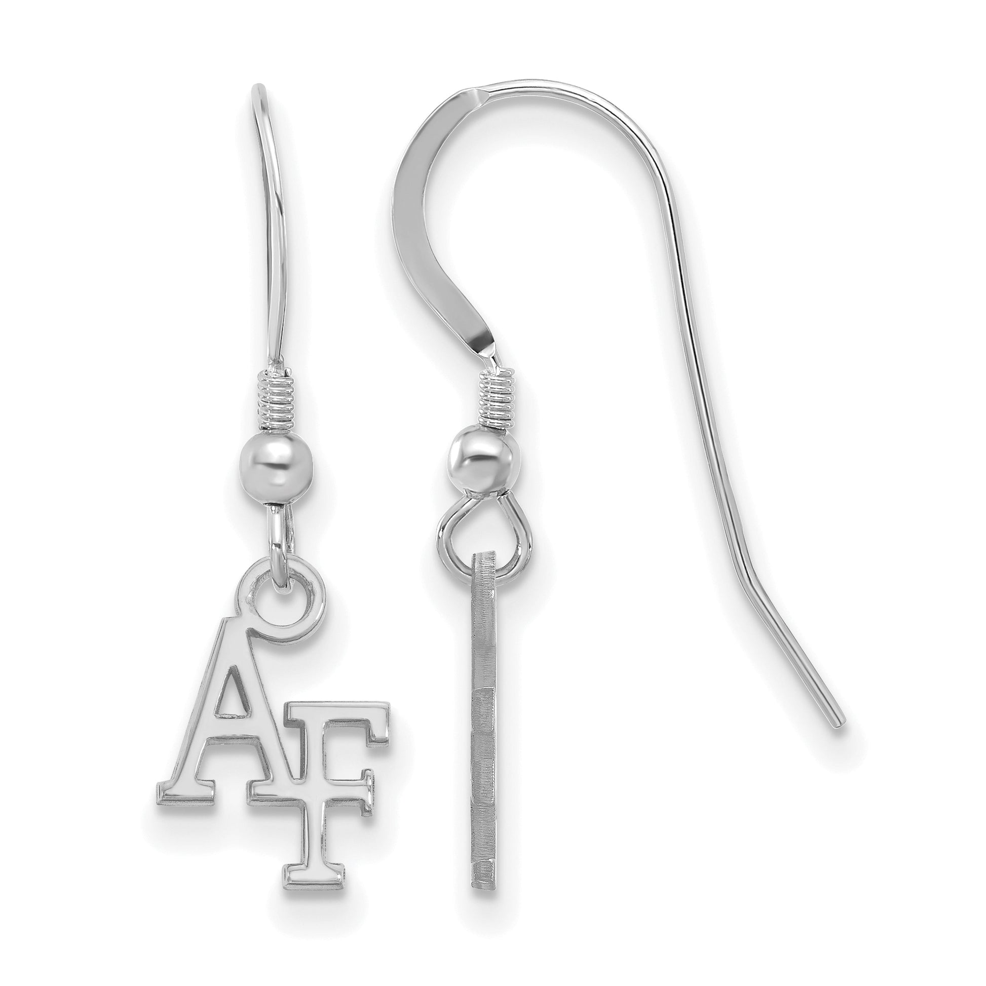 Show off your pride with the Sterling Silver Rhodium-Plated Logoart United States Air Force Academy A-F Extra Small Dangle Wire Earrings. Crafted from pure sterling silver, these earrings feature a sleek rhodium finish that resists tarnish and adds shine. Measuring just 29 mm, they are perfect for daily wear or special occasions. The tiny, detailed Air Force logo dangles gracefully from a secure French wire closure, blending style with a badge of honor. Designed for women who love subtle yet meaningful jewelry, the Air Force Academy earrings promise comfort and sharp appeal.