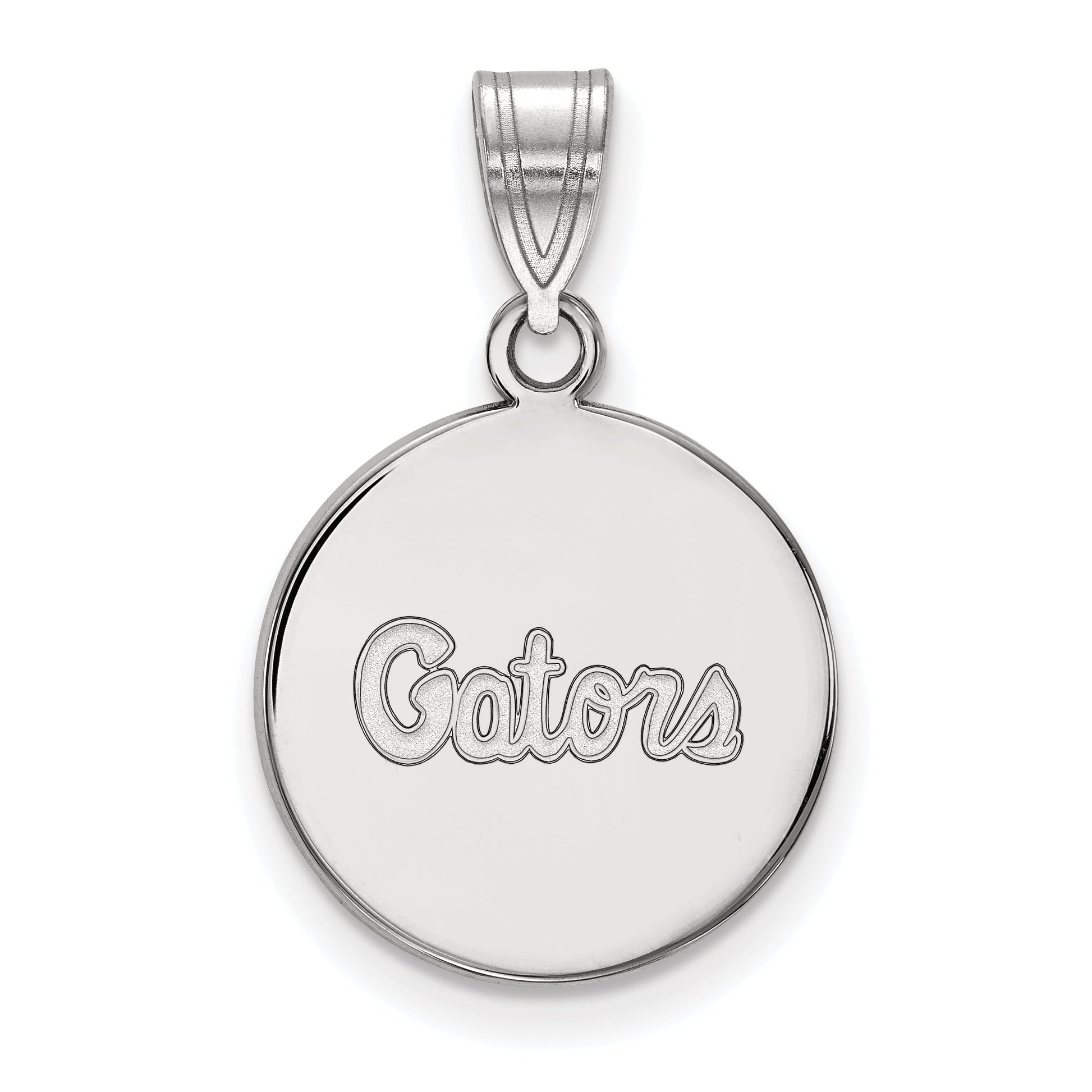 Show your school pride with the Sterling Silver Rhodium-Plated Logoart University of Florida Gators Script Medium Disc Pendant. Crafted from 925 sterling silver and coated in shiny rhodium, this pendant features the official UF Gators logo in a sleek script design. Measuring 22 mm long with a 15 mm width, it’s a bold yet subtle addition to any look. The laser-cut process ensures precision, and the silver-tone finish adds a touch of elegance. Perfect for fans who want to wear their school spirit close, the logois licensed by NCAA and made by LogoArt LLC. Wear it proudly and let everyone know your team is always in your heart.