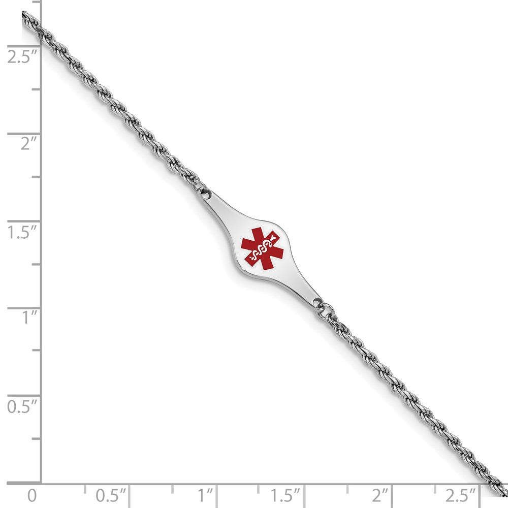 The Sterling Silver Rhodium-Plated Medical ID Rope Link Bracelet is a sleek piece perfect for daily wear. Crafted from 925 sterling silver, it features a polished finish and a durable 7-inch rope chain, making it comfortable and stylish. The bracelet includes a red enamel accent charm that adds a pop of color to its elegant design. Its lobster clasp ensures a secure fit, and the ID plate can be personalized with important medical info. With its modern look and reliable build, the Sterling Silver Rhodium-Plated Medical ID Rope Link Bracelet offers both safety and style for women.