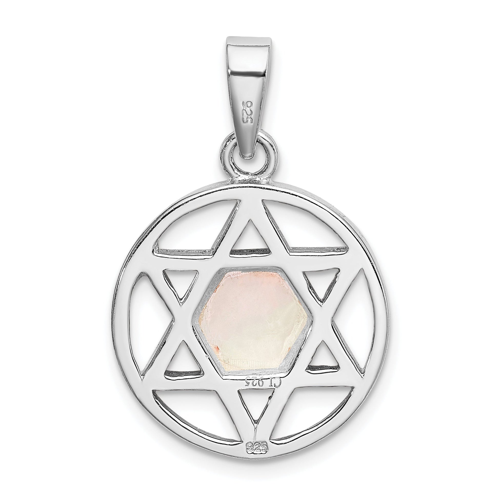 The Sterling Silver Rhodium-Plated Mop Star Of David Pendant sparkles with timeless elegance. Crafted with 925 sterling silver, this pendant showcases a polished finish and features a single, luminous mother of pearl stone. The natural white stone is encased in a solid structure, offering both beauty and durability. Measuring 30 mm in length, the pendant embodies a refined star design with dimensions of 22 mm in length, 19.5 mm in width, and 3 mm in thickness. Enhanced with a rhodium plating, the silver tone shines brightly, making it a versatile piece for any attire. A symbol of faith and style, the Sterling Silver Rhodium-Plated Mop Star Of David Pendant is a perfect gift or personal keepsake.