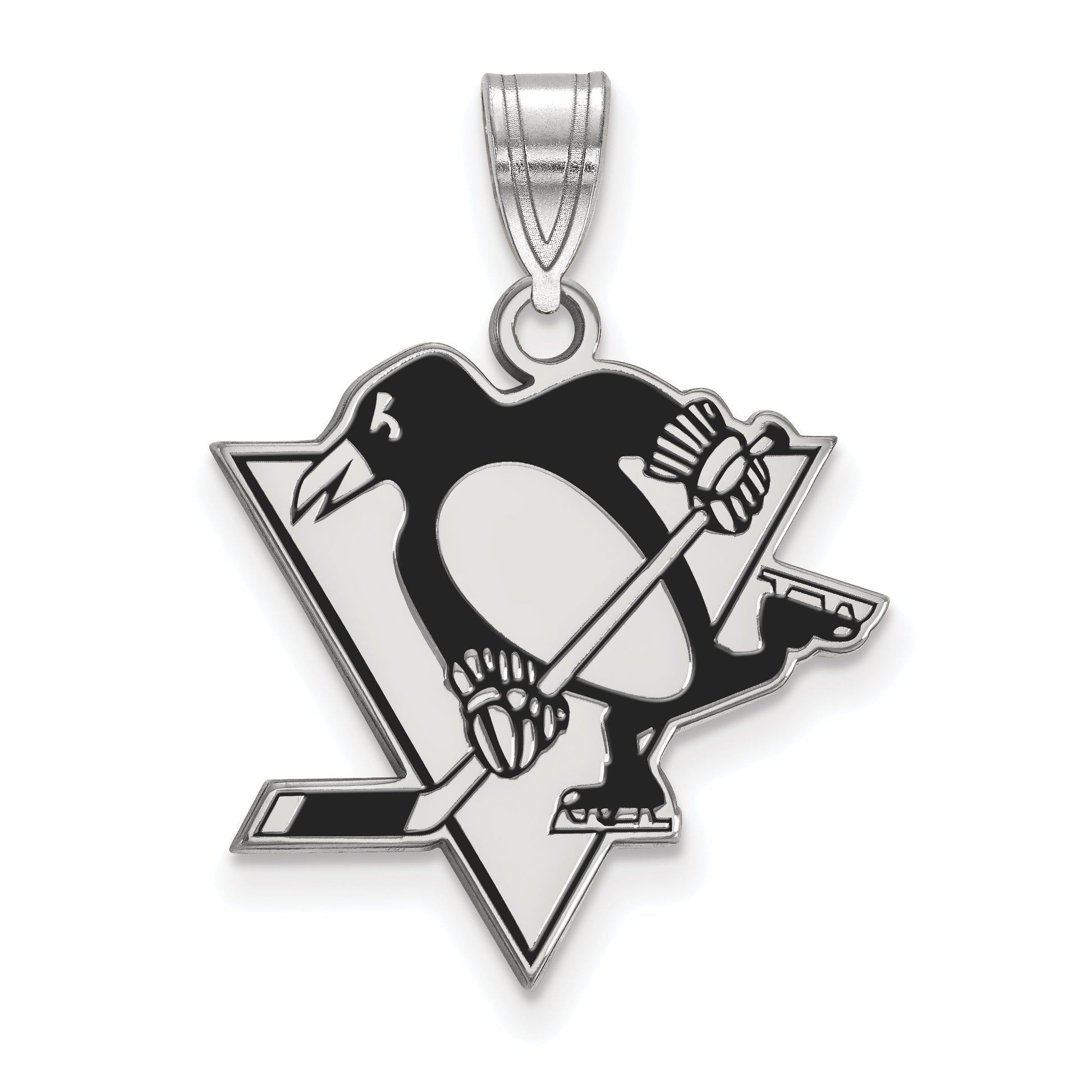 Show your team spirit with the Sterling Silver Rhodium-Plated NHL Logoart Pittsburgh Penguins Pendant. Crafted from high-quality sterling silver, this large pendant features the iconic Penguins logo in bold enamel. The rhodium plating gives it a sleek silver shine that resists tarnish. It measures 25 mm long and 20 mm wide, making it eye-catching but easy to wear. Perfect for fans who want to display their pride, the pendant has a sturdy bail for quick on-and-off. This pendant is a true tribute to Pittsburgh, blending stylish design with team loyalty.