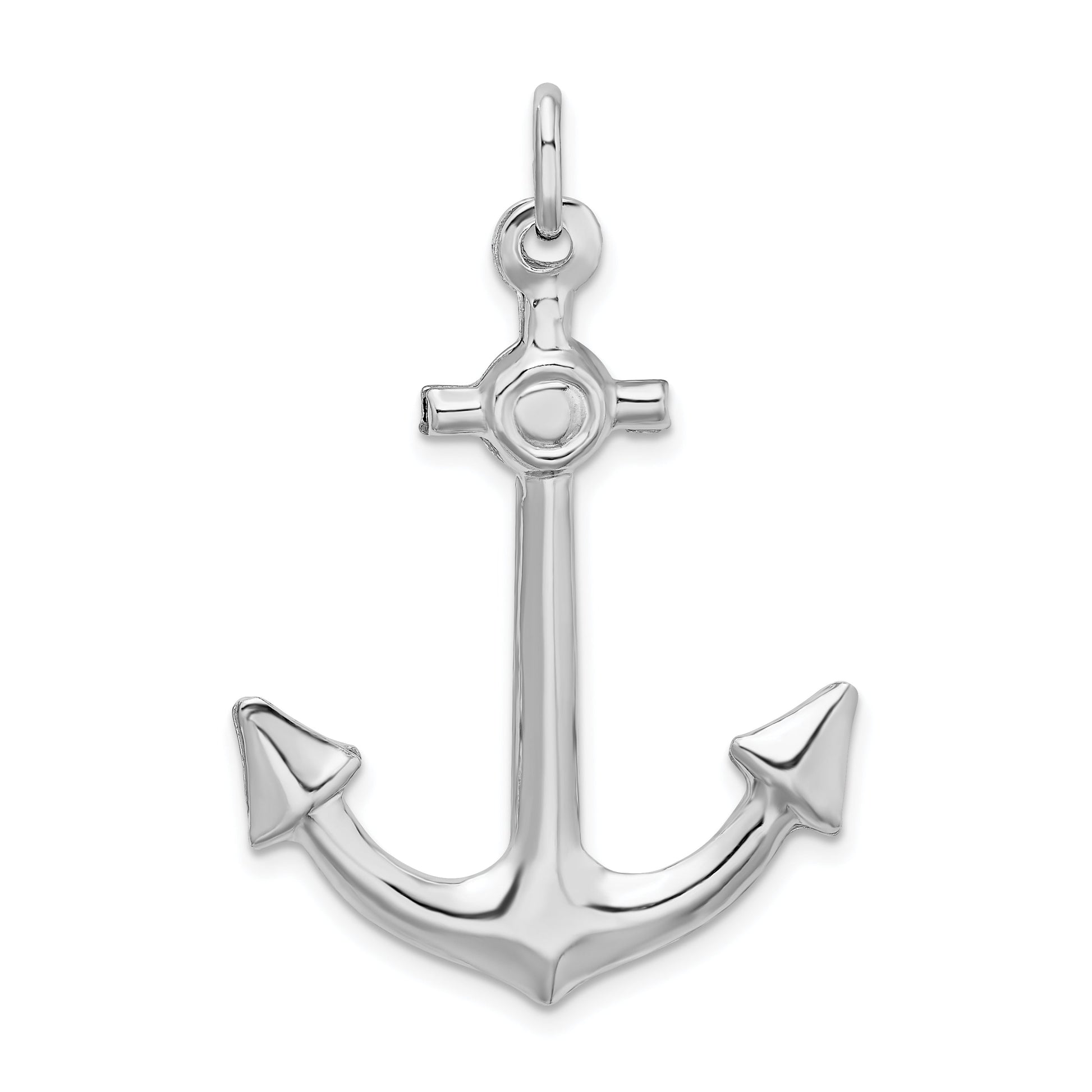 The Sterling Silver Rhodium Plated Polished Anchor Charm offers a stylish and timeless look for any wardrobe. Handcrafted from 925 sterling silver, this charm exudes elegance with its polished finish and rhodium plating. Measuring 44 mm in length and 27 mm in width, it features a 3D hollow design that conveys depth and dimension. The anchor charm is suited for men’s jewelry and can be easily paired with any chain for a complete look. Adding the Sterling Silver Rhodium Plated Polished Anchor Charm to your collection ensures a touch of sophistication and nautical flair.