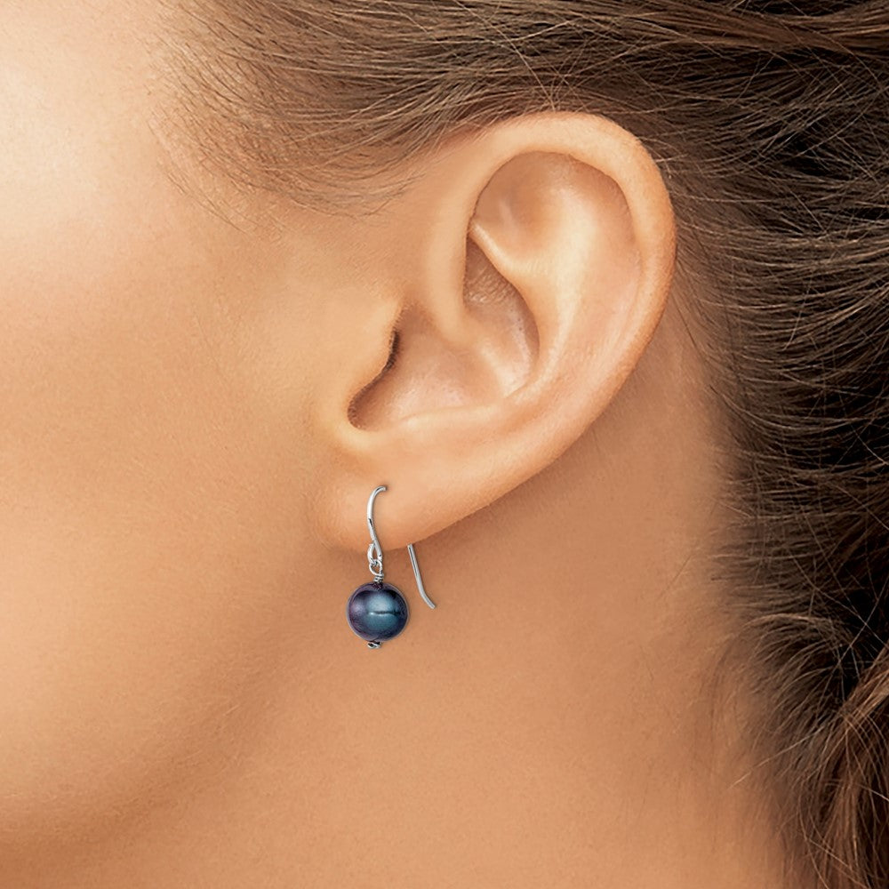 Introducing the Sterling Silver Rhodium-Plated Polished Black Freshwater Cultured Pearl Dangle Earrings, a must-have pair for any jewelry lover. Crafted from 925 sterling silver, these earrings feature elegant black pearls ranging from 7.5 to 8.5 mm, giving a chic touch to any outfit. The rhodium plating enhances their silver-tone shine while ensuring long-lasting wear. French wire closures promise comfort and ease of use. These semi-round cultured pearls are beautifully dyed for consistent color. Perfectly sized, they add sophistication to both casual and formal looks. Treat yourself to these Sterling Silver Pearl Dangle Earrings for a touch of timeless elegance.