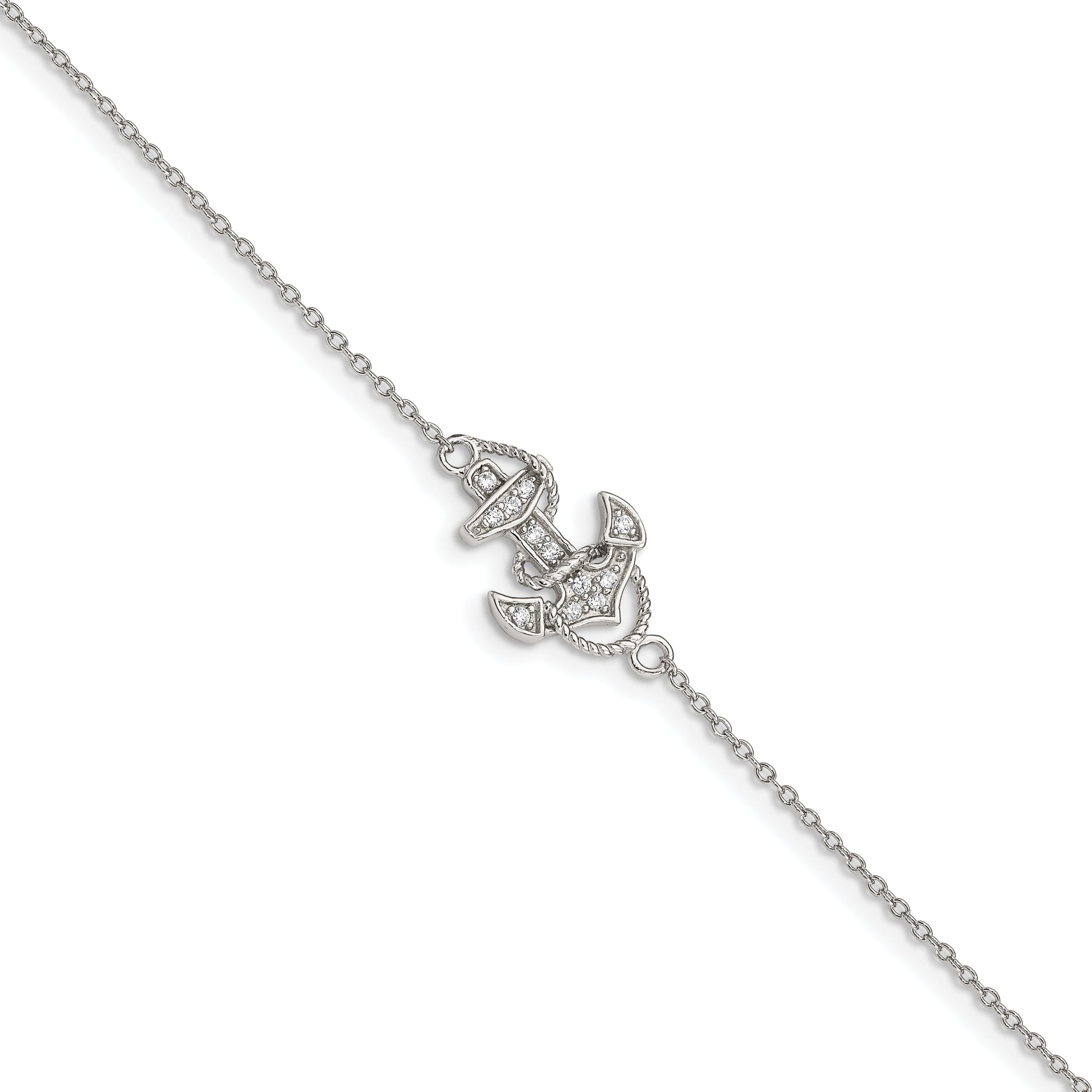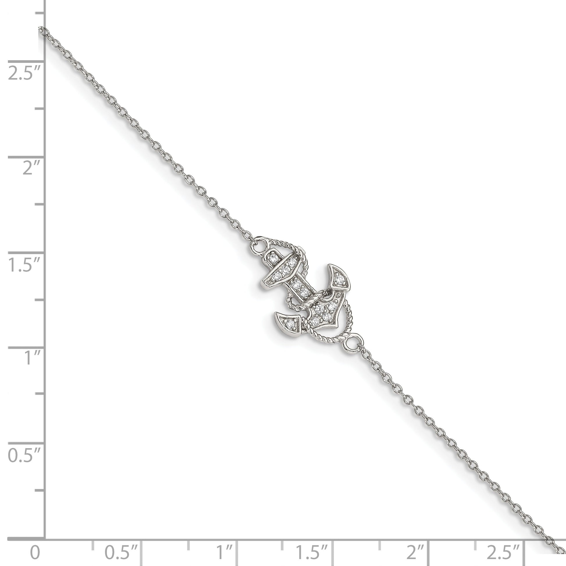 The Sterling Silver Rhodium-Plated Polished Cz Anchor Bracelet is a true testament to elegance and craftsmanship. Made from pure 925 sterling silver, this 7-inch beauty is perfect for women who appreciate sophisticated jewelry. The polished finish gleams, while the white cubic zirconia stones sparkle brilliantly, offering a synthetic yet radiant allure. Its sturdy cable chain ensures durability, and the spring ring clasp guarantees a secure fit. This fancy anchor bracelet brings a touch of nautical charm, embodying style and grace in every detail. Elevate your ensemble with the Sterling Silver Rhodium-Plated Polished Cz Anchor Bracelet today.