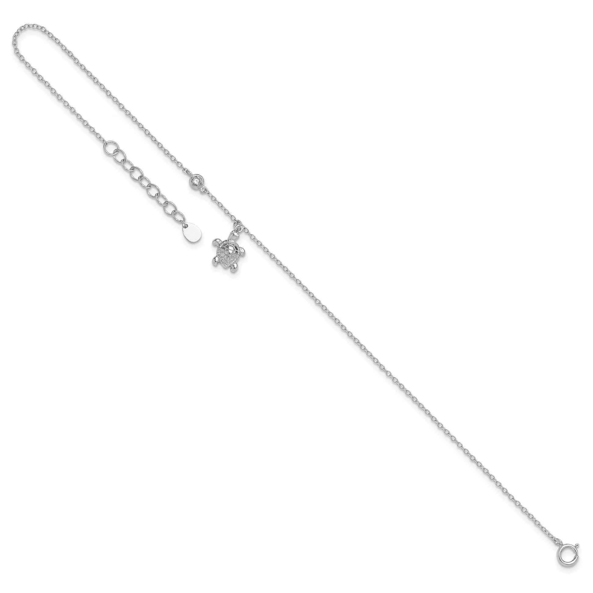 The Sterling Silver Rhodium-Plated Polished CZ Turtle Anklet is a must-have for lovers of elegance and sea life charm. Made with 925 sterling silver, this anklet features a stunning white cubic zirconia turtle centerpiece, adding a dash of sparkle to your steps. The polished rhodium plating gives a sleek, silver-tone finish, ensuring durability and shine. At a length of 9 inches, plus a 1-inch extension, it offers a comfortable fit with its adjustable spring ring clasp. With a delightful cable chain design, this anklet beautifully adorns any ankle, making it the perfect accessory for any woman.