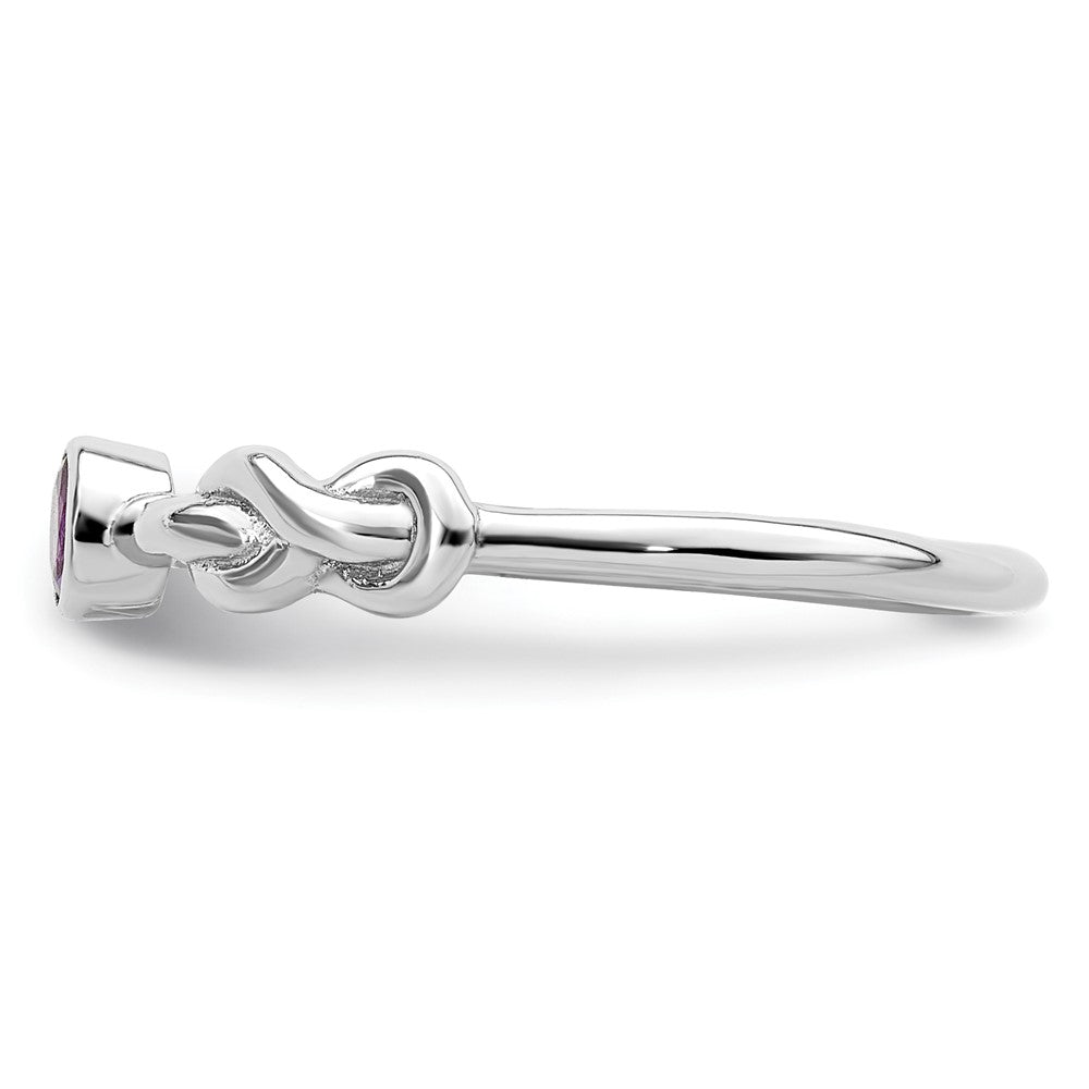 Experience elegance with the Sterling Silver Rhodium-Plated Polished Infinity Amethyst Ring. Crafted from 925 sterling silver, this piece glows with a polished finish. Its centerpiece, a natural amethyst, radiates in deep purple and is bezel set with expert precision. The ring showcases a delicate band, 1.5 mm wide, with a tasteful infinity symbol. This birthstone ring, ideal for February, is enhanced by a sleek rhodium plating that wards off tarnish. The Sterling Silver Rhodium-Plated Polished Infinity Amethyst Ring enhances any outfit with its sparkle and timeless allure.