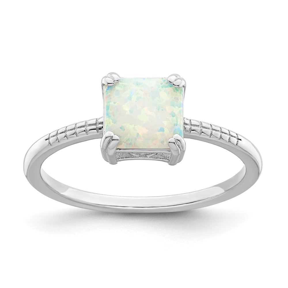 Discover the Sterling Silver Rhodium-Plated Polished Square White Created Opal Ring, a stunning piece that adds elegance to any look. Crafted from pure sterling silver and finished with a shiny rhodium coating, this ring features a dazzling lab-created white opal in a square shape. Its sleek design offers a wide, polished band and a 5 mm high stone that catches the light beautifully. Perfect for women who love a blend of modern style and classic shine, the Sterling Silver Rhodium-Plated Polished Square White Created Opal Ring is a must-have addition to your jewelry box.