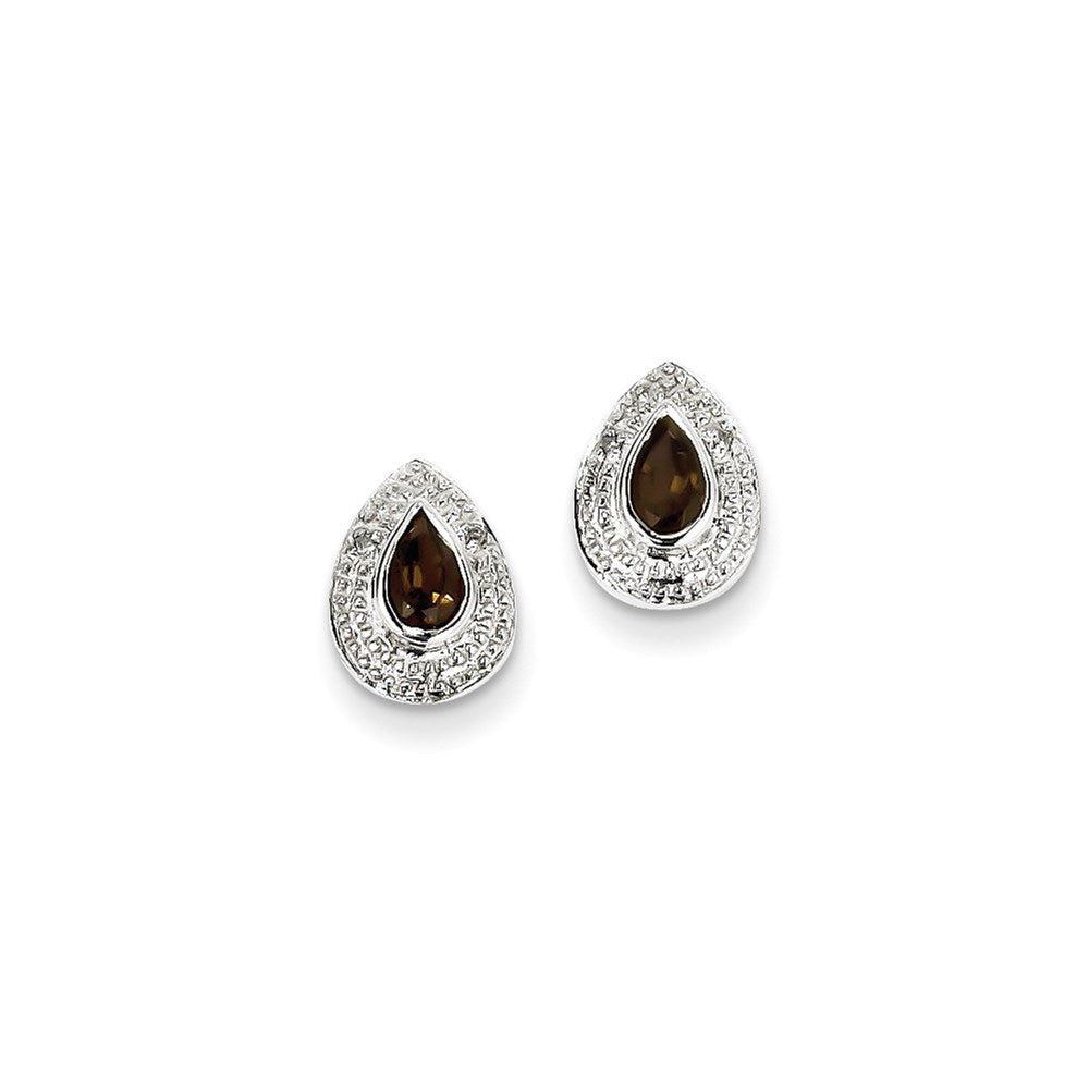 These are earrings made of sterling silver and rhodium plated. They have smoky quartz and natural diamond stones. The earrings are 10 mm long and 7 mm wide. They have a pear shape and are set in bezels. The smoky quartz stone weighs 0.36 ct, and the diamond stones weigh 0.01 ct. The earrings have a post and push-back closure. They are designed to be worn as button earrings.