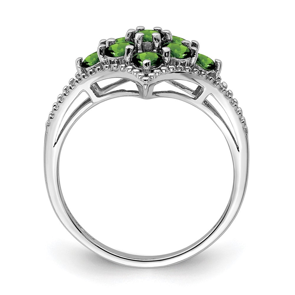 The Sterling Silver Rhodium Plated Tsavorite Ring is a stunning piece that combines elegance with vibrant color. Crafted from 925 sterling silver, this piece features nine natural Tsavorite garnets set in a bold round shape. The ring is polished with a sleek rhodium finish that adds shine and prevents tarnish. Its textured band is 2 mm wide, providing a comfortable fit for women who love sparkle and style. With a top length and width of 14.5 mm, this ring makes a bold statement. Perfect for any occasion, the Sterling Silver Rhodium Plated Tsavorite Ring blends beauty with quality.