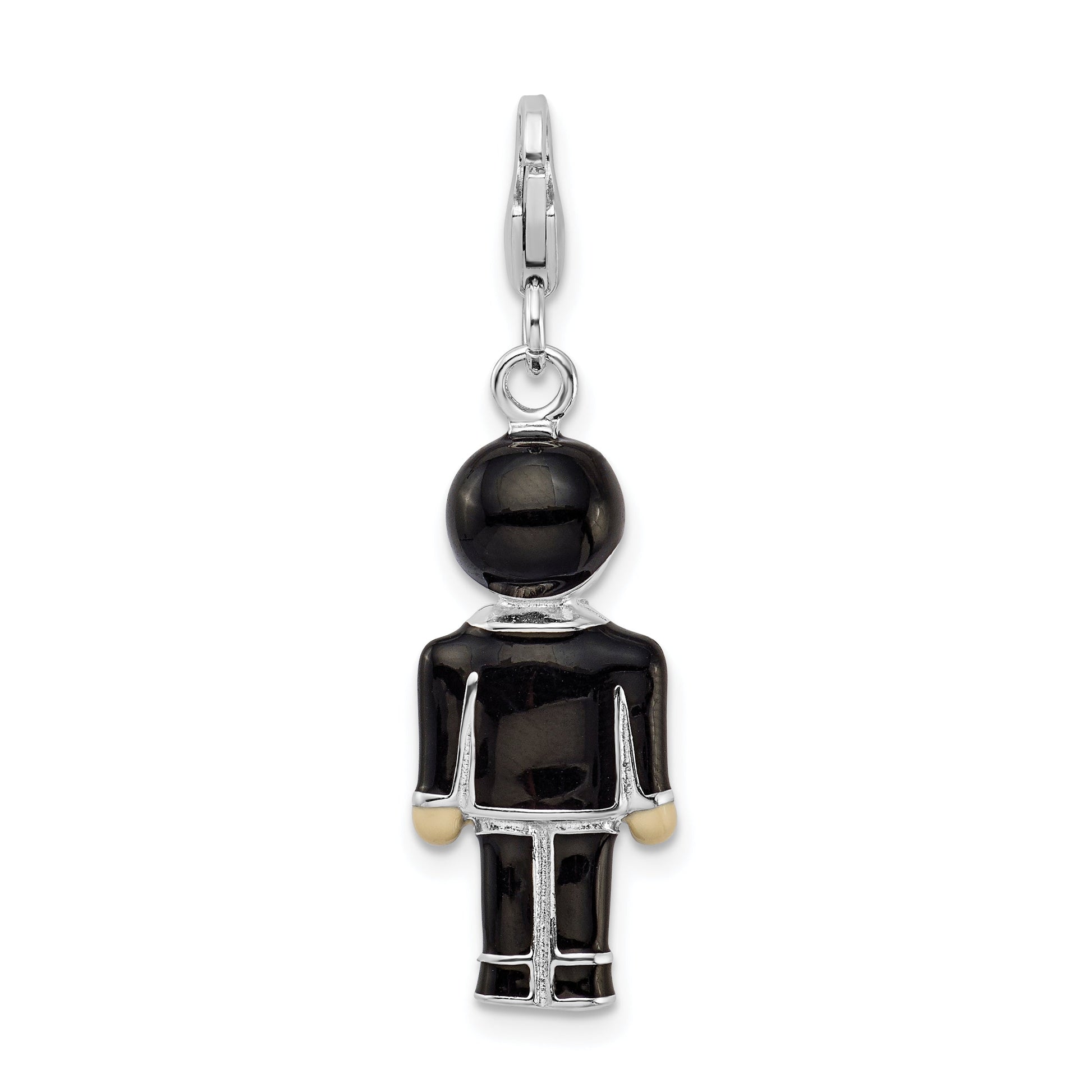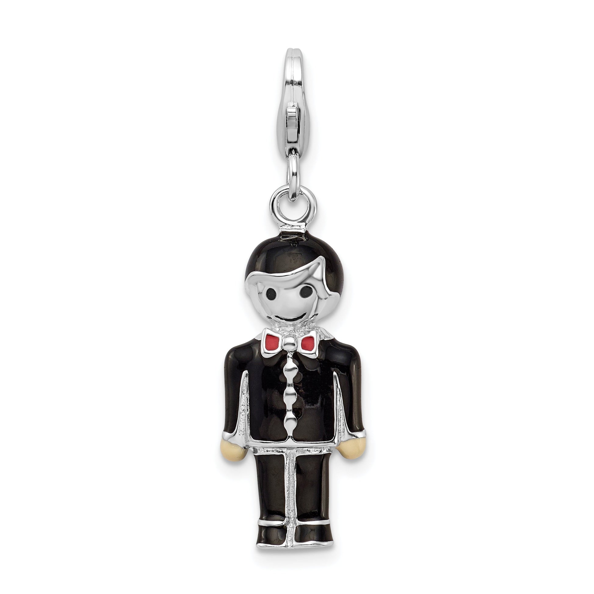 The Sterling Silver Rhodium-Plated Black Enamel Groom Charm offers a sleek blend of elegance and charm. Crafted from 925 sterling silver, this exquisite piece features a 28mm length and a striking black enamel accent. The rhodium plating enhances its shine and durability, making it a solid choice for any occasion. This casted charm includes a secure lobster clasp for ease of wear and boasts dimensions that fit perfectly with any necklace or bracelet. Its timeless appeal ensures the Sterling Silver Rhodium-Plated Black Enamel Groom Charm remains a cherished addition to any jewelry collection.