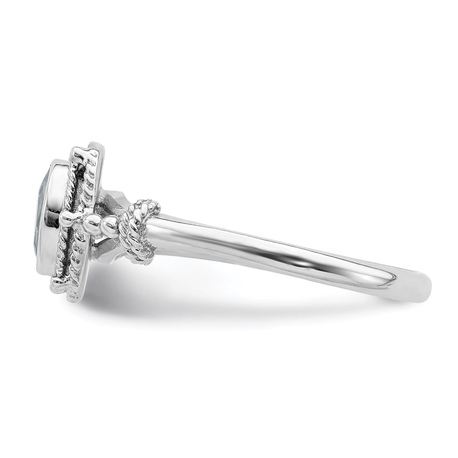 The Sterling Silver Rhodium-Plated Blue Oval CZ Stone Ring is a chic addition to any jewelry collection. Crafted from high-quality 925 sterling silver, it features a vivid blue cubic zirconia stone set with an eye-catching invisible setting. With a polished finish and textured band, this ring offers a sleek look. The oval-shaped stone measures 3.56 by 5.95 mm and sits at a height of 6.07 mm, making it a perfect statement piece for women. The open-back design ensures a comfortable fit. Discover the beauty of the Sterling Silver Rhodium-Plated Blue Oval CZ Stone Ring that adds a pop of color to any outfit.
