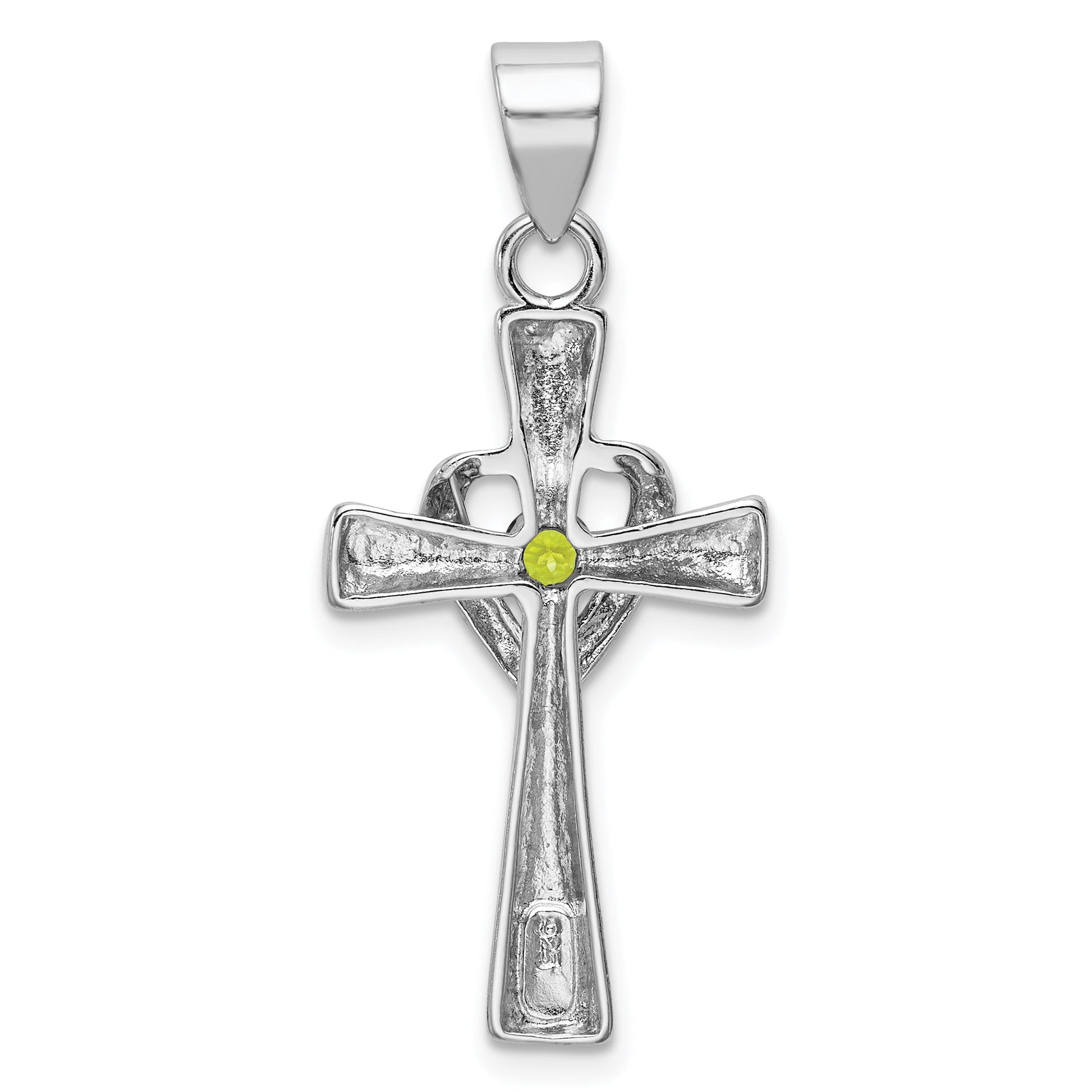 Discover elegance with the Sterling Silver Rhodium-Plated Peridot Heart Cross Pendant. This beautifully crafted piece, made from 925 sterling silver, features a rhodium finish for a lasting shine. The pendant boasts a natural green peridot stone at its heart, adding a vibrant touch. Measuring 33mm in length, the solid charm presents a distinct cross shape with heart accents. Its polished surface ensures it catches light with every movement. Sold individually, this pendant makes a thoughtful gift or a cherished addition to your collection. Express your style with the Sterling Silver Rhodium-Plated Peridot Heart Cross Pendant.