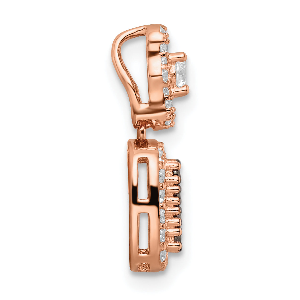 Discover the exquisite Sterling Silver Rose-Tone Black Rhodium-Plated Fancy Cz Pendant, a masterpiece that radiates elegance. Crafted from premium 925 sterling silver, this pendant captures attention with its polished finish and captivating cubic zirconia stones. It boasts 37 white and 16 brown stones, each artfully arranged in a round shape and treated for flawless brilliance. The black rhodium accents enhance its mystic allure, while rose-tone flash plating gives it a modern twist. Perfect for any outfit, the Sterling Silver Rose-Tone Black Rhodium-Plated Fancy Cz Pendant is an exceptional choice for those seeking sophistication and style.