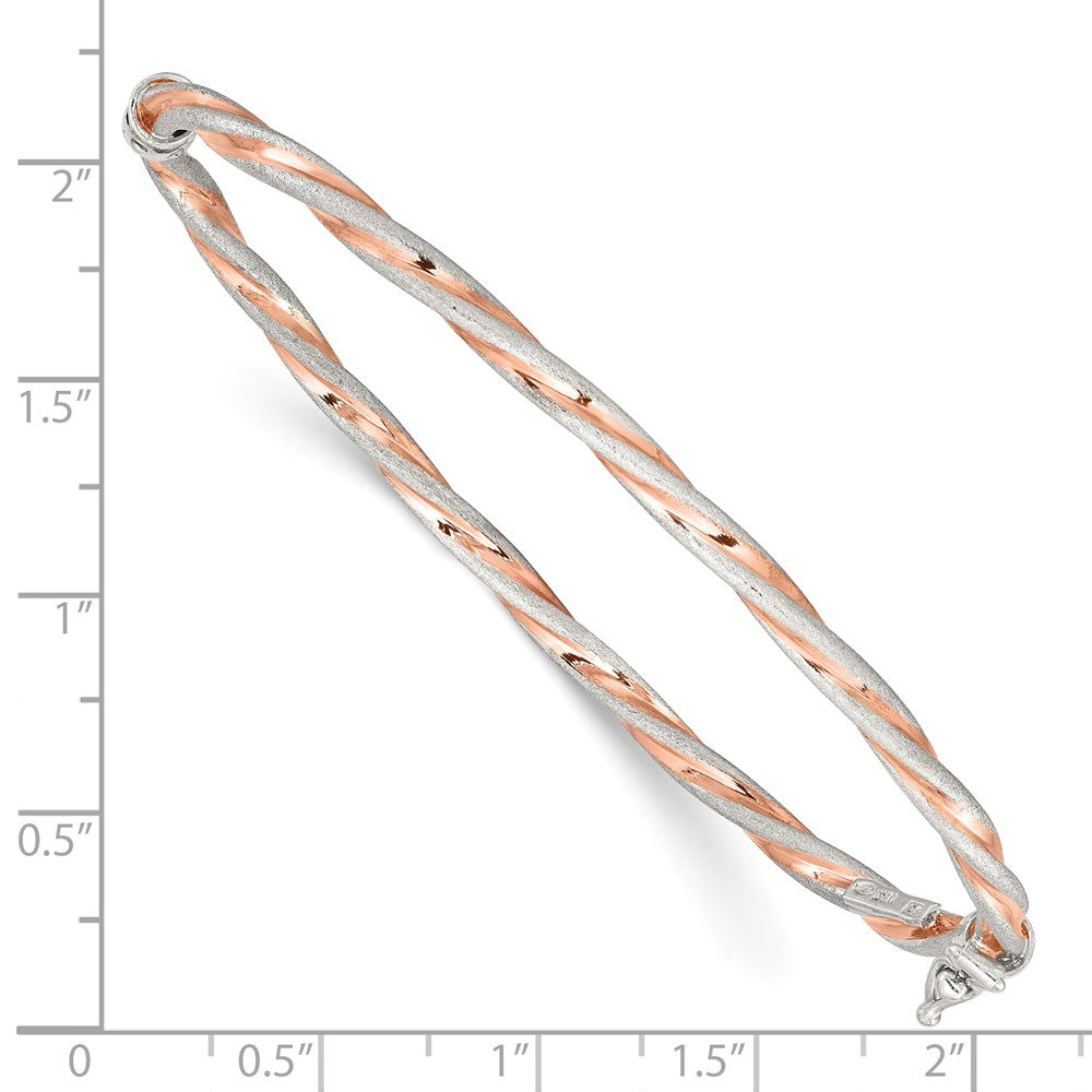 The Sterling Silver Rose-Tone Satin/Polish Twisted 3mm Hinged Bangle blends elegance with style, making it a must-have for any jewelry collection. Crafted from high-quality 925 sterling silver, this bangle features an eye-catching rose-tone flash plating that adds a touch of luxury and charm to its sleek design. Its unique twisted texture and satin-polished finish create an alluring interplay of light and shadow. Measuring 7 inches in length and featuring a secure box catch clasp, this hinged bangle is a comfortable fit for women seeking sophistication and a timeless look. The Sterling Silver Rose-Tone Satin/Polish Twisted 3mm Hinged Bangle is an exquisite piece that elevates any outfit with its graceful shine.